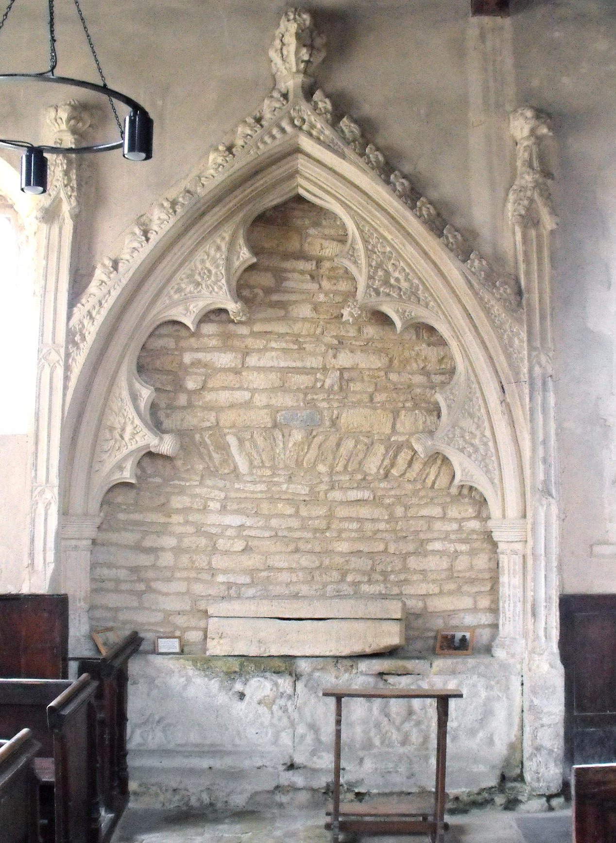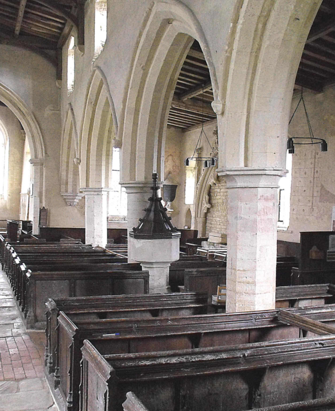 The interior of the building displays a number of features of interest. The four-bay arcade (illustrated right from the west) is formed of double-flat-chamfered arches springing at either end from corbels supported by figures, and in between, by piers that are consecutively octagonal, circular, and octagonal again. This again is Early English, but the aisle itself has a tomb recess in the S. wall (illustrated at the foot of the page, on the left), in Decorated style, with a double-cusped arch with leaf carving in the foils and carved heads terminating the lower cusps, a surmounting crocketed gable, and narrow buttresses at the sides. There are remnants of paintings on the aisle walls, including a fragment of a St. Christopher, of whom almost nothing remains except his feet, standing among fishes.