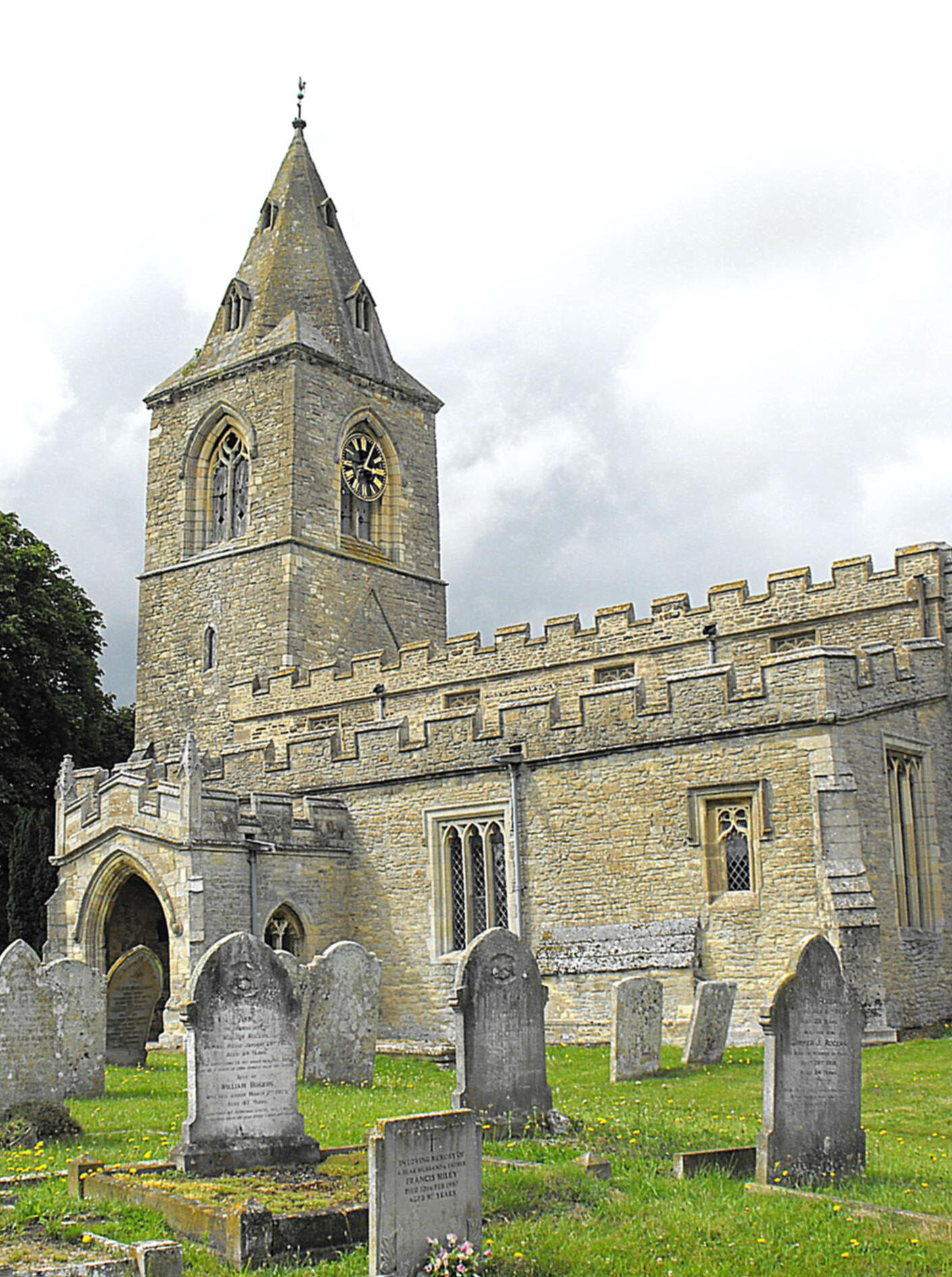 A church in mixed style, built of creamy Jurassic limestone.