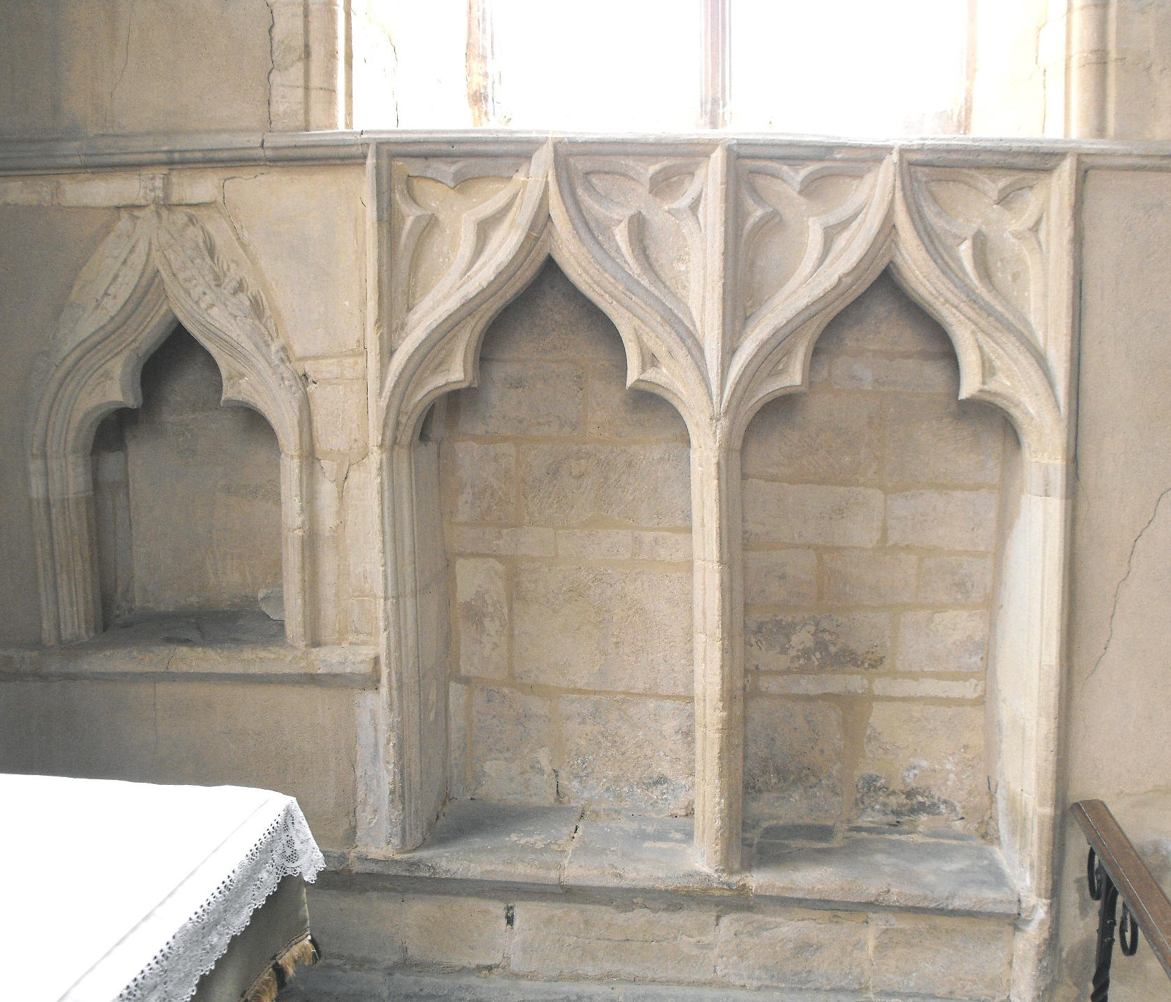 The heavy tower arch is formed of three flat-chamfered orders, supported beneath the outer order by semi-octagonal responds; the stair rises in the southwest angle and is entered through a door aligned in the diagonal. The chancel arch bears an inner flat chamfer and an outer wave moulding above semi-octagonal responds and has spread to such a degree that it is now much wider at the top than the bottom, as, indeed, is the chancel E. window, which has since been glazed accordingly! The easternmost chancel S. window has a double sedilia below, formed of equal ogee-pointed, trefoiled bays, and east again, there is a trefoil-cusped piscina (shown at the foot of the page on the right).