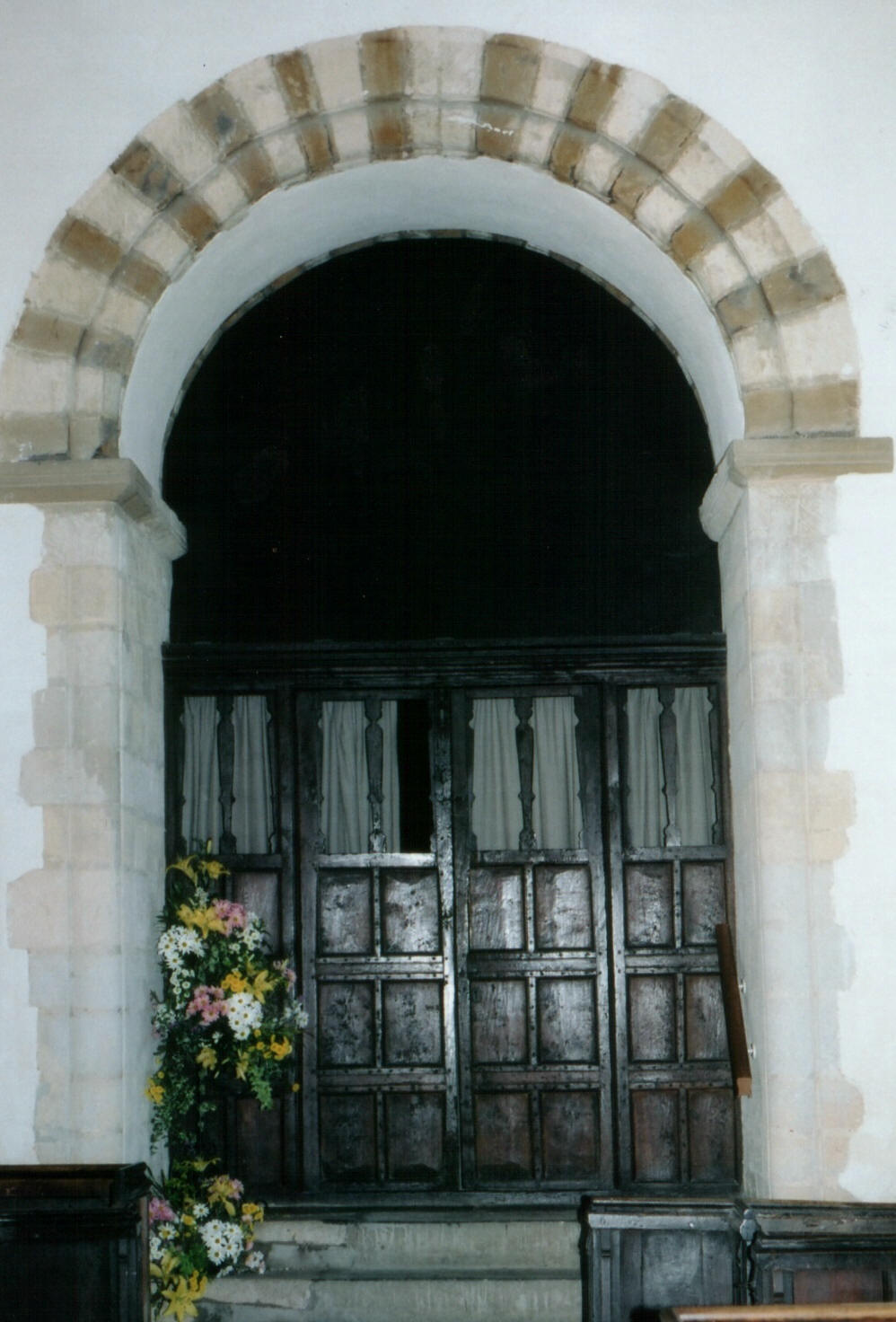Some woodwork must be considered briefly. The nave roof is new but the chancel roof of very low-pitched, tie-beam construction, probably dates from the fifteenth century. The small octagonal pulpit on a partly modern base, was considered by Pevsner to be Elizabethan. Thirdly, the old, panelled screen set in the tower arch, though not of especially high quality, is probably contemporary with the rebuilding of the tower: it is formed of four bays, of which the inner two are hinged. |