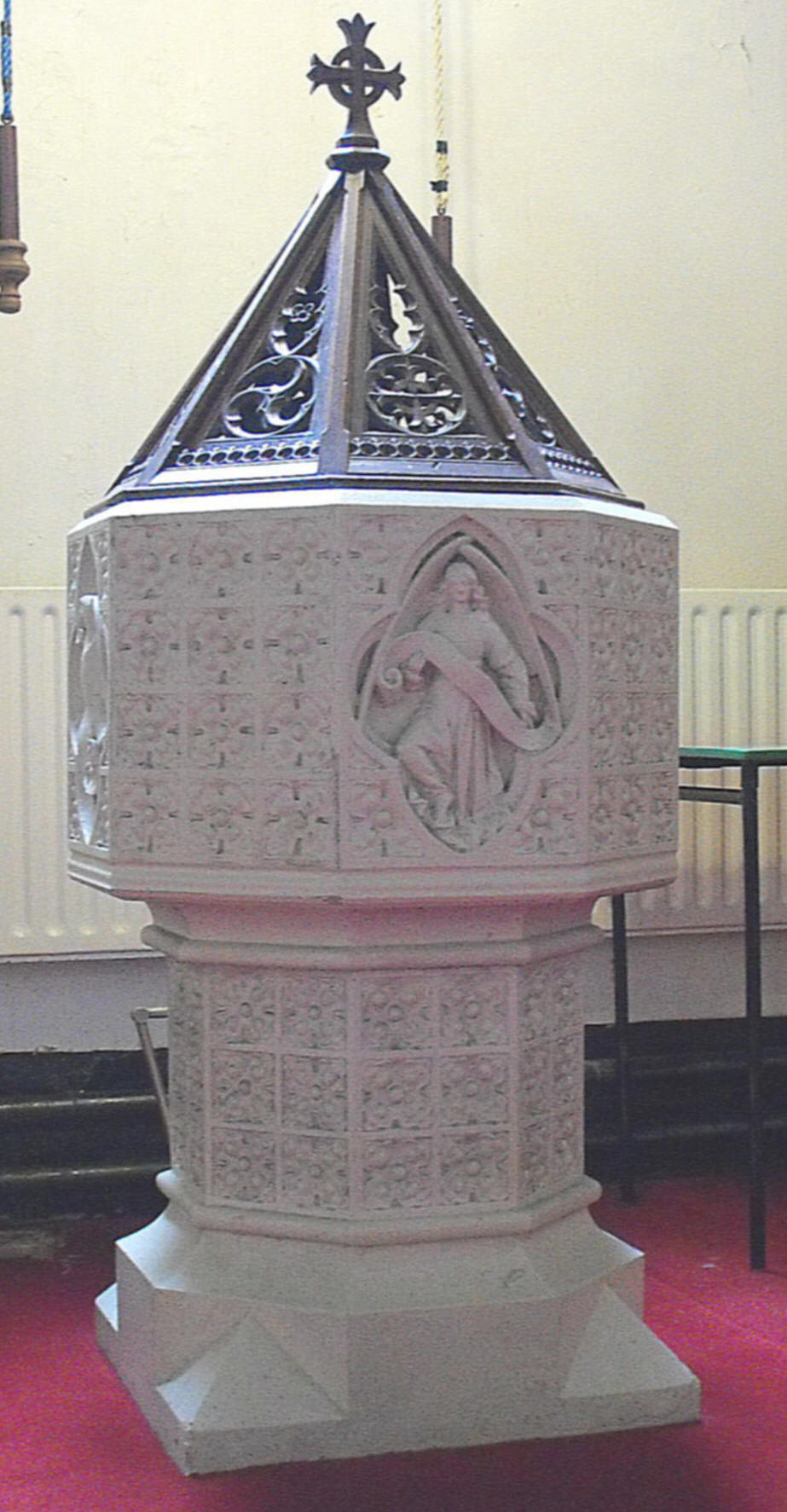 Small suppliers included such people as Thomas Gill, who provided 124 lbs. of lathe nails, but also specialist companies such as Mrs. Mawer's ornamental stone company of Leeds, who made the font donated by 'two sisters in memory of a beloved mother' (shown above left) and so not priced, and Thomas Hodges, bell founder of 99, Middle Abbey Street, Dublin (on the face of it, a curiously located company to approach), who having been asked for two small and presumably cheap bells for the bell-cote, had to explain to the Rev. Sanders that the smallest bells he could provide that would differ in tone would be 17 and 19½ inches in diameter and would cost £10.5s.0d and £13.19s.0d respectively.