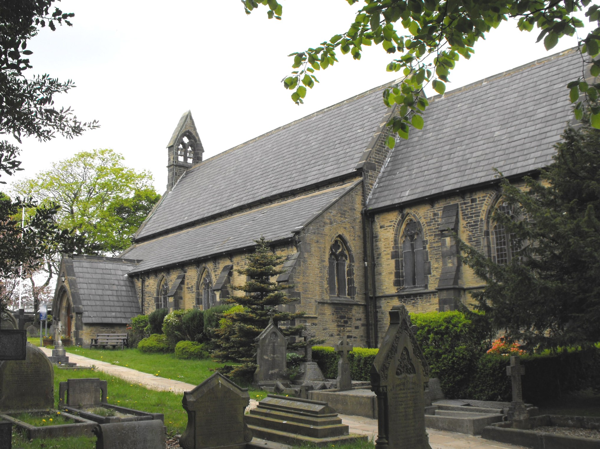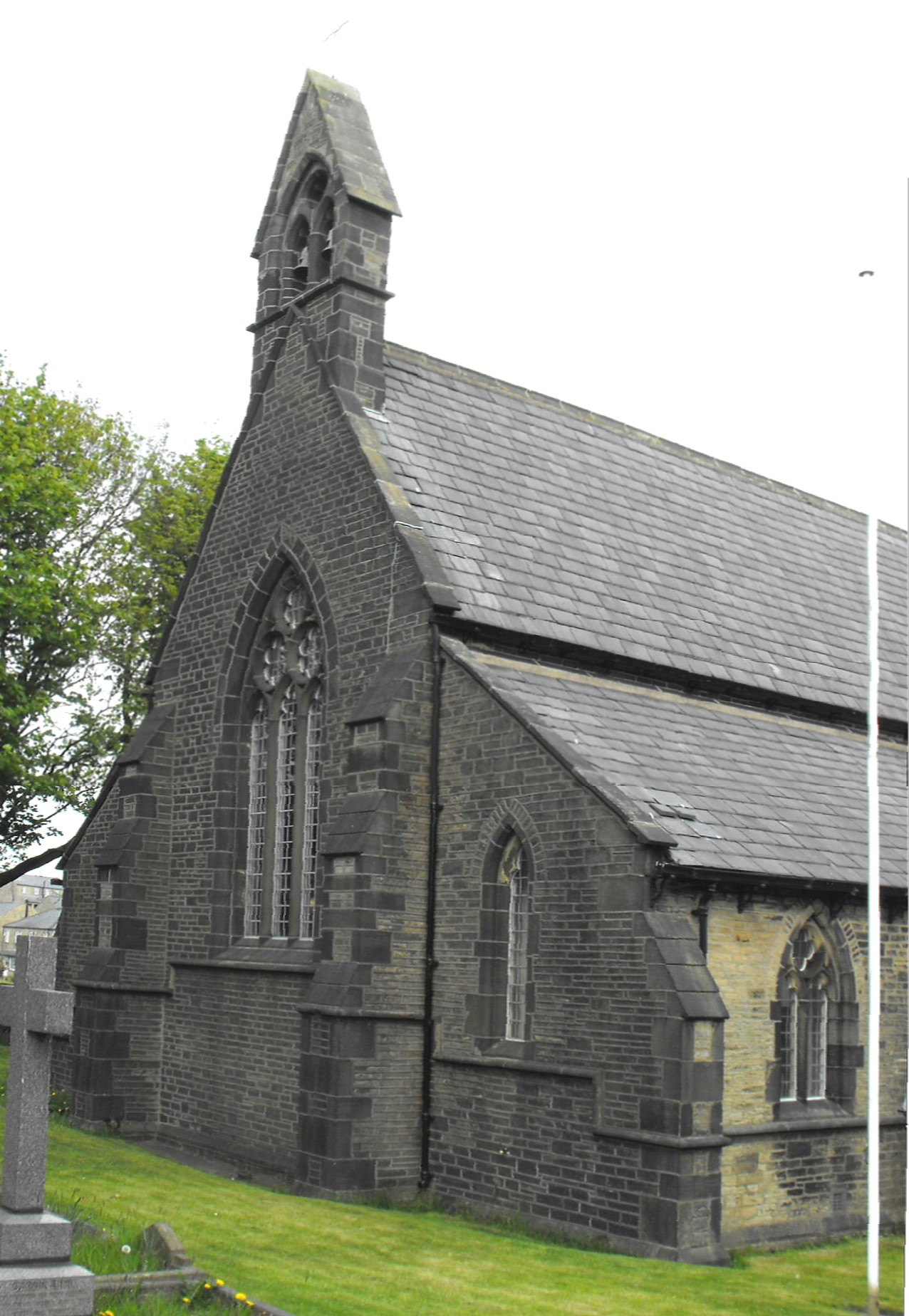 This is a small, neat church by Mallinson and Healey, erected in 1852-4 in a what is still an attractive semi-rural position on the moors above Ripponden. Comprising just an aisled nave and chancel with a S. porch, N. vestry and bell-côte over the west gable, its lack of size is compensated by its attractive masonry and steep tidy roofs of uniform grey slates, but its particular interest derives from the extensive collection of records of its construction preserved in the West Yorkshire Archives at the Wakefield record office (WDP21/252). A printed appeal dated 19th April 1852, sent out by the Rev. James Sanders, M.A., Perpetual Curate at Ripponden from 1847-73, and others, sets the scene: The ancient Chapelry of Ripponden is situated on the eastern side of Black-stone-edge, which separates it from the adjoining county of Lancaster. Within a circumference of twelve miles - comprising upwards of 13,000 acres of land, chiefly moor and pasture - it contains a scattered population of 12,000 persons. They are almost exclusively of the working classes, being very small farmers and others dependent on manual labour. For this extensive Chapelry there is only one Church with accommodation for 800, which is rather less than one-eighth of the inhabitants, and not a single free sitting for the poor...