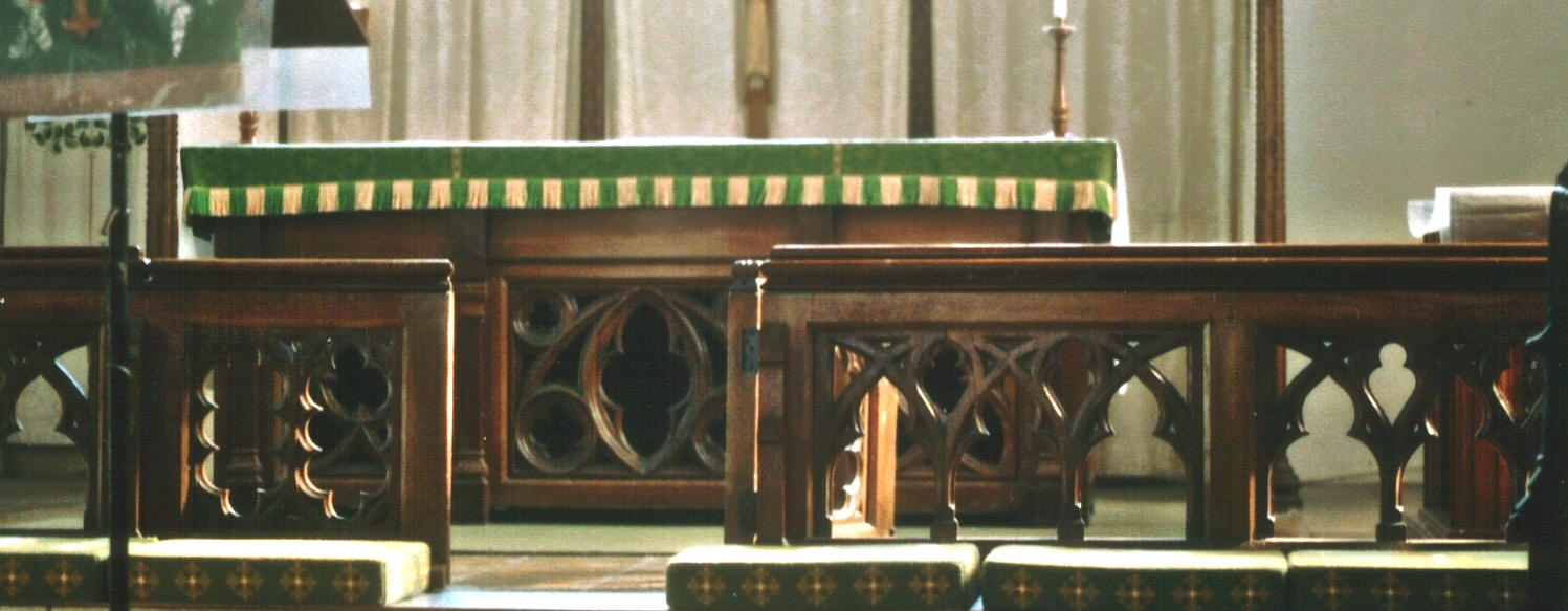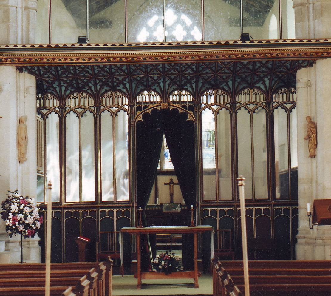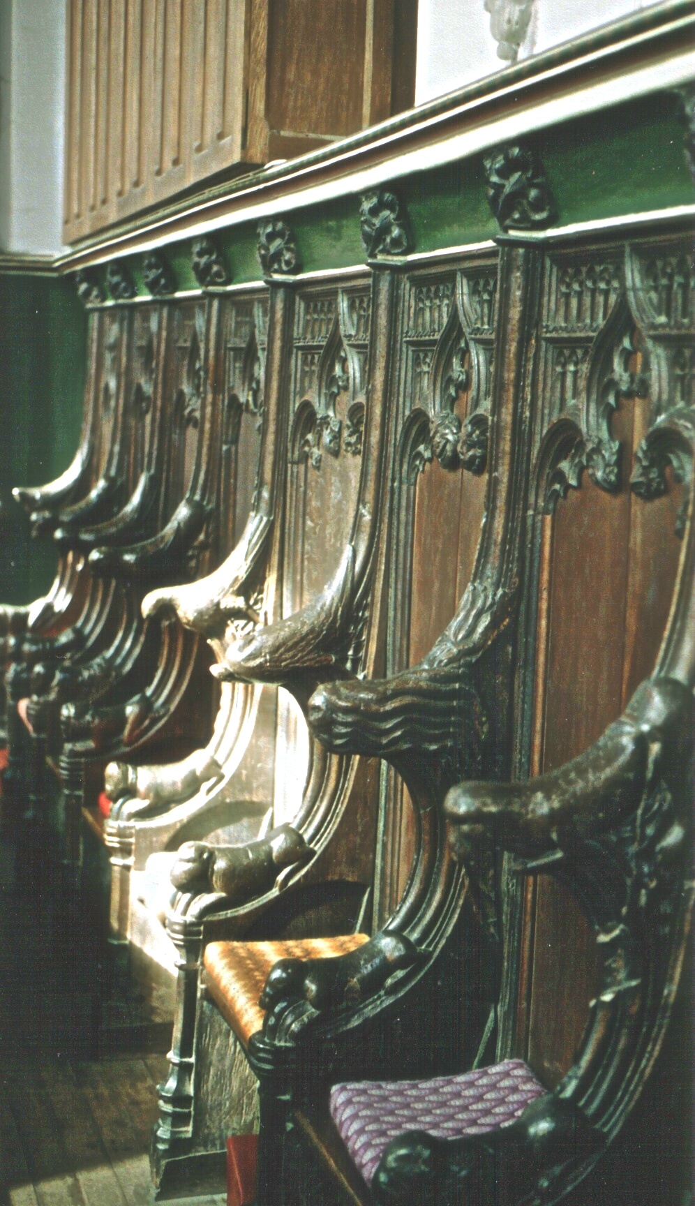 Six of the seats, all still hinged, back against the rood screen (illustrated