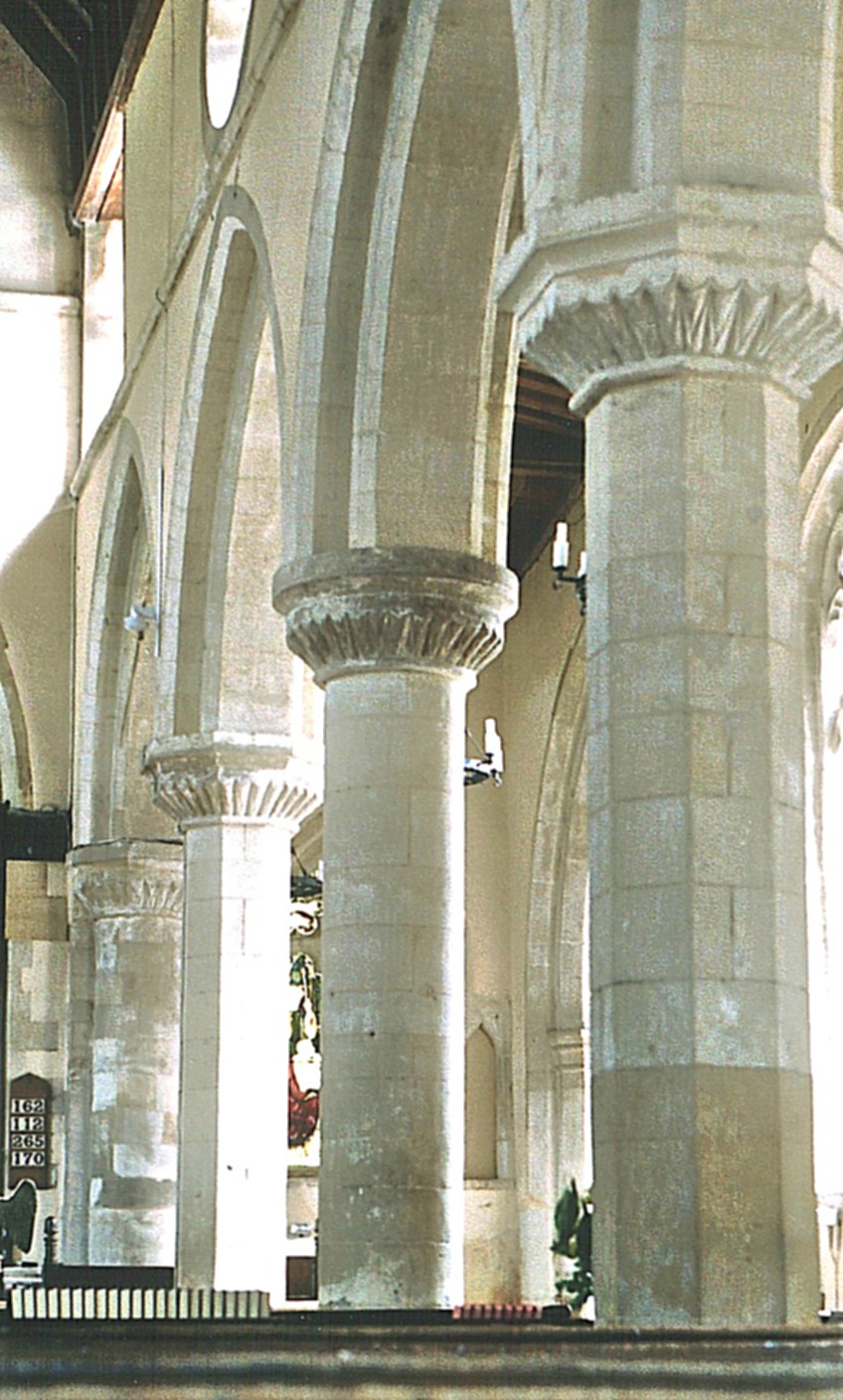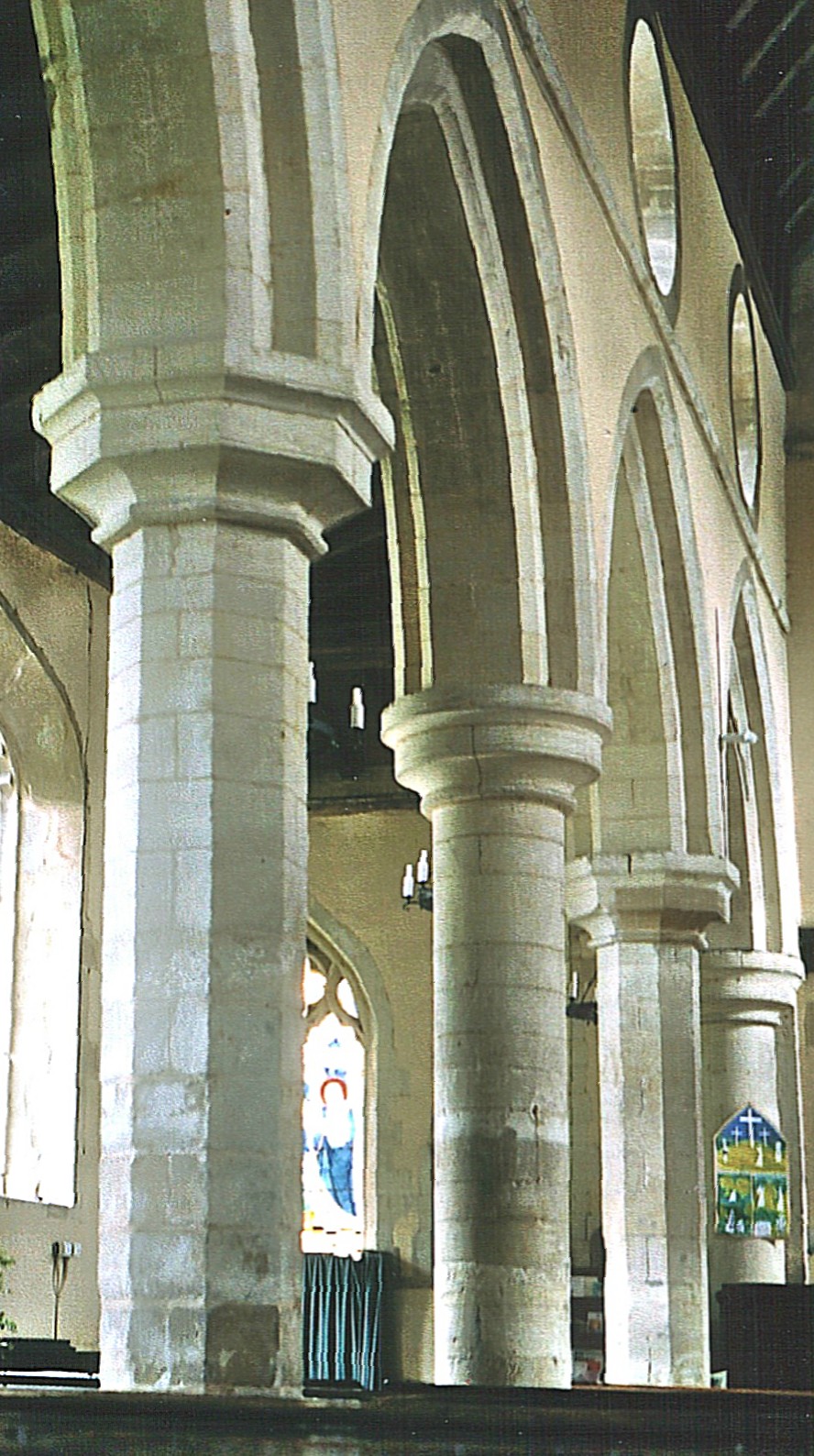 However, the nave and five-bay nave arcades predate this work by possibly half a century, being composed of tall, double-flat-chamfered pointed arches supported on alternately circular and octagonal piers with plain capitals to the north and scalloped capitals to the south (as illustrated left and below right respectively), suggesting, perhaps, that the S. arcade was built first. A further arch leads from the S. aisle to the S. transept, but there is no equivalent arch to the north. The chancel arch, balanced precariously on corbels, dates from a Victorian restoration.