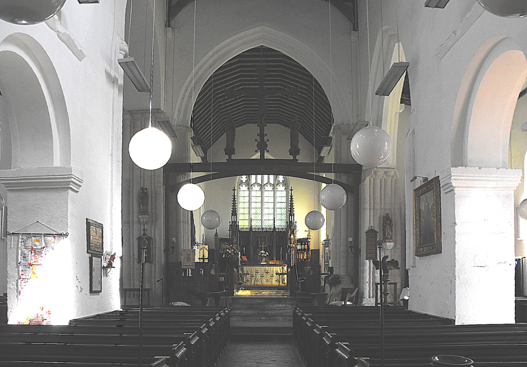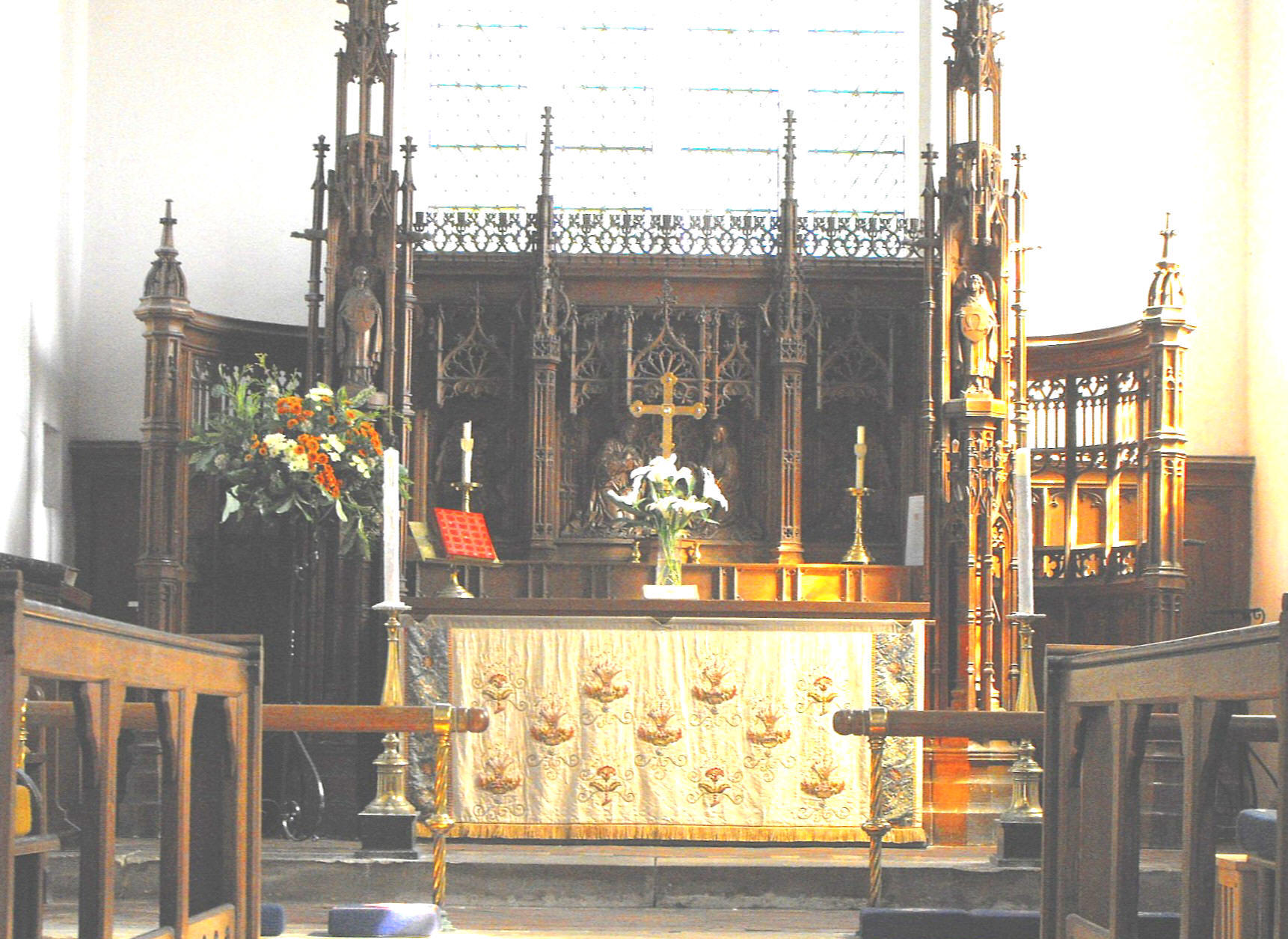 Finally after all this, carpentry and furnishings in the church are not of much consequence. The nave roof is reputedly dated 1637 on one of its beams (British Listed Buildings website) but looks largely restored. The two-bay stepped sedilia with a piscina beyond, recessed in the chancel S. wall, would fit c. 1300. The large wooden reredos (below) features tabernacle work rising between panels portraying a nativity scene in low relief in the centre and angels on either side, but whether it is Victorian or later, the name of the artist appears to be unrecorded.
