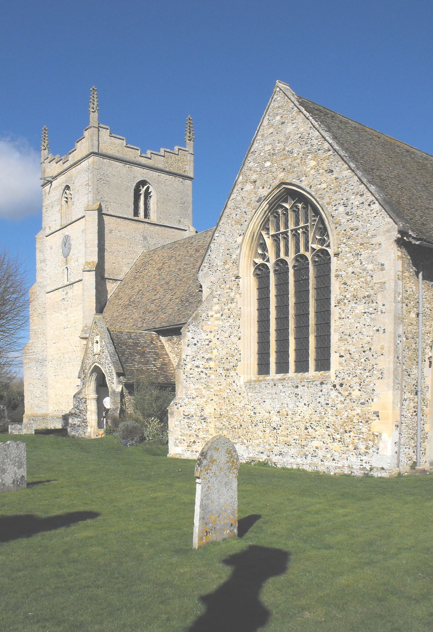 The church (seen above, from the north, and below, from the southeast) stands in a quiet corner of the village and is constructed chiefly of flint, pebbles and clunch rubble, with limestone dressings and tiled roofs. The tower and rebuilt N. transept have been rendered.