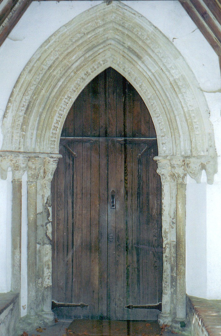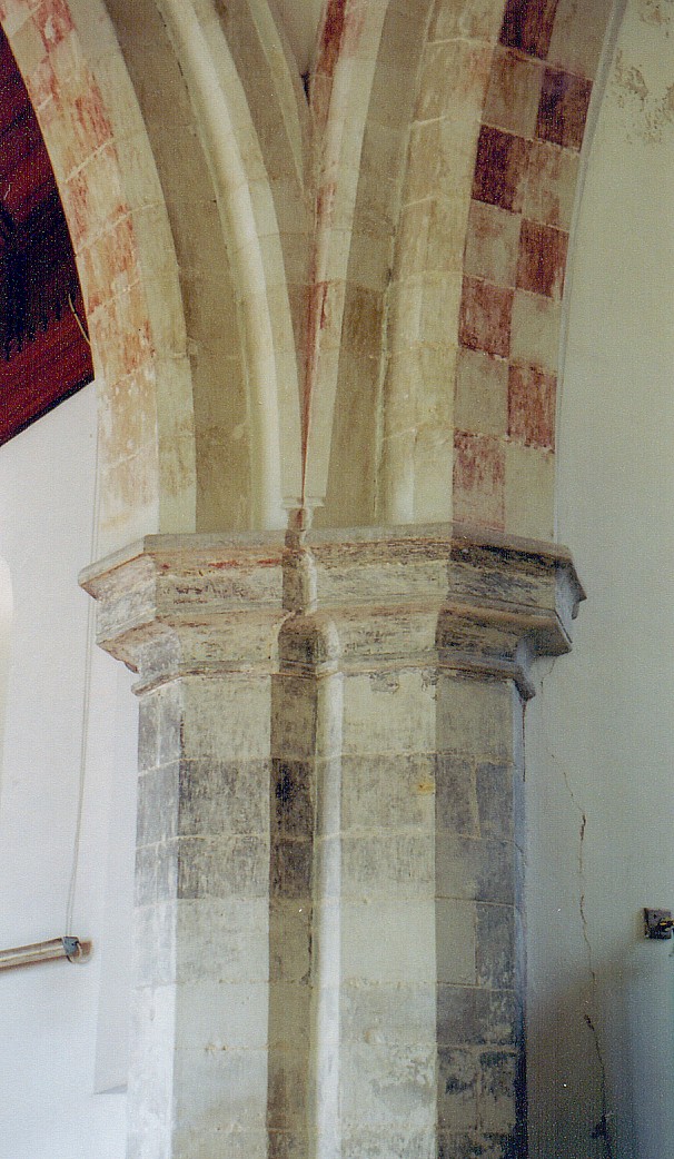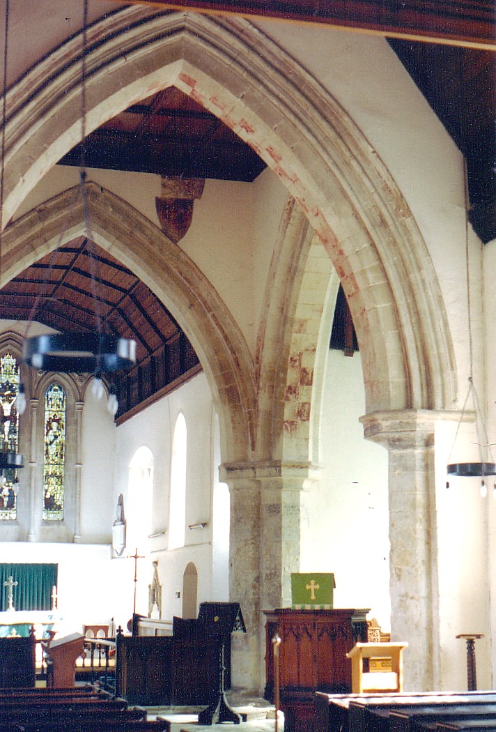 St. Nicholas's was once cruciform in plan and although the central tower was taken down in Perpendicular times and replaced with the present tower at the west end, the massive crossing arches remain. Crossing, nave, transepts and chancel are all essentially Early English in style, notwithstanding the Norman window in the nave N. wall (shown above right) showing some of the fabric to be older. Nevertheless by the year 1300 this must have appeared an almost completely thirteenth century building of very satisfying form and general uniformity. Of windows remaining from that time, there are two lancets remain in the S. transept W. wall, a third in the chancel S. wall together with the remains of a fourth beside an inserted Perpendicular lowside window, a group of three stepped lancets deeply set inside double chamfered surrounds in the chancel E. wall, one large lancet and two small ones in the chancel N. wall, and yet three more in the nave N. wall. The S. transept E. wall is filled by a blocked arch that probably once led to a small chapel and, if that was the case, it is likely to have been apsidal, for the masonry of the chancel S. wall does not suggest that chancel and chapel were linked at any time. Externally this blocked arch can be seen to have been double-flat-chamfered and supported on semi-octagonal responds, but internally it is decorated with rolls and dog-tooth moulding. The church is entered through a fourteenth century S. porch with an Early English inner doorway formed of an acute arch of three orders (shown below left), with colonnettes at the sides and more rolls and dog-tooth above. The church interior is very light thanks to the absence of stained glass, and being also aisleless, the crossing arches create the dominant impression (shown below right, looking southeast, and at the foot of the page, where the northwest pier is illustrated). They are appropriately tall and heavy, supported on semi-octagonal responds, and are all double-flat-chamfered except for the west face of the W. arch which bears rolls with fillets. The lancets in the chancel E. wall are set between colonnettes in shaft rings.