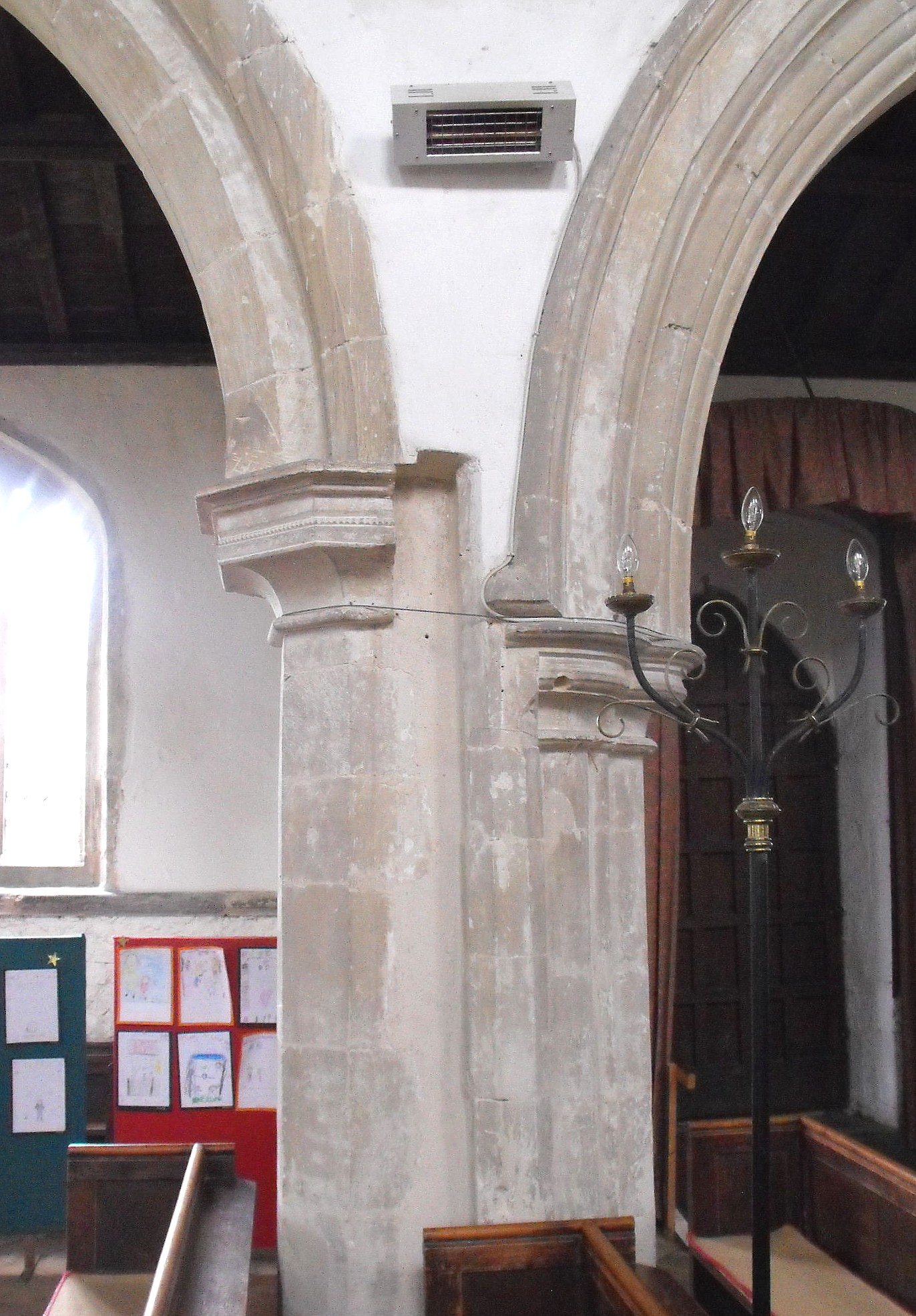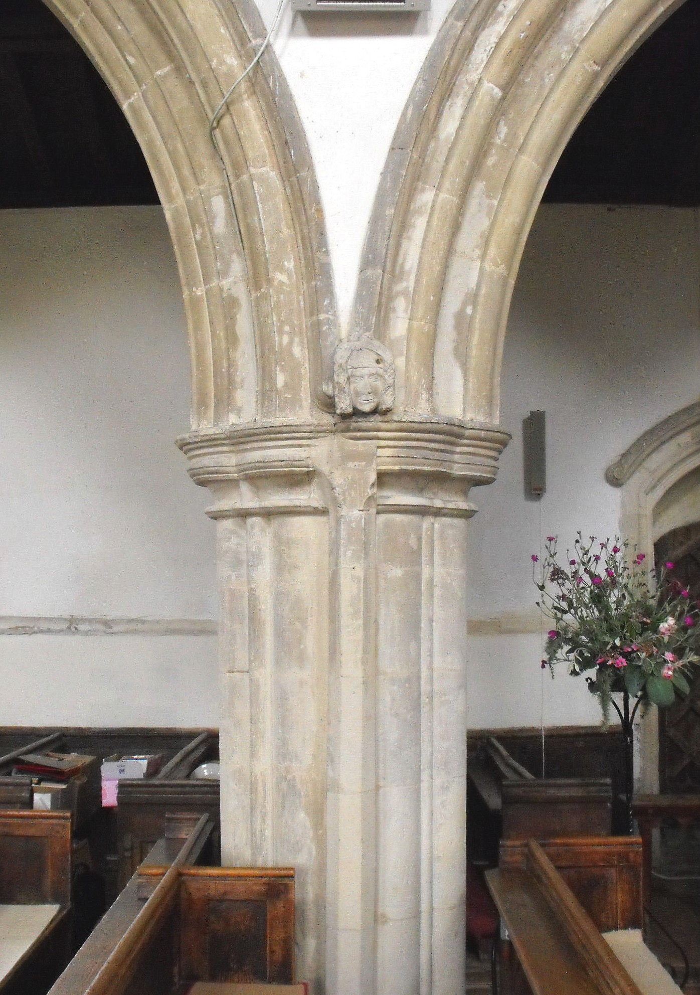 Inside the building, a more complicated story is revealed. The aisle arcades (seen above from the west) are six bays long and each formed of two distinct parts with breaks represented by a couple of short wall pieces, one in the middle of the S. aisle (illustrated below left), dividing it into two sections of three bays, and one after the fourth bay from the east in the N. aisle (below right), where the wall piece (if it may be so called) is scarcely four inches wide. Not one of these sections is identical to any one of the others but by far the most dissimilar is the eastern section of the S. arcade, composed of double-flat-chamfered arches springing from tall octagonal piers and semi-octagonal responds, with nailhead around the capitals of the W. respond and eastern pier, characteristic of c. 1170 - 1300. Pevsner suggested these bays might indicate the length of the original church (The Buildings of England: Cambridgeshire, Harmondsworth, Penguin, 1970, p. 398), which would have rendered it somewhat out of proportion, but as he seems not to have noticed the subtler difference between the two parts of the N. arcade, which also requires explanation, perhaps the correct interpretation is that the earlier church was four bays long, with - from the thirteenth century onwards - a three-bay S. chapel butting up against a porch to the west. (Notice the piscina recessed in the east end of the S. aisle south wall.) The four-bay N aisle could have been added shortly after c.1350, judging from the arcade carrying two sunk quadrants and dripstones rising from large head label stops (the only part of either arcade to have them) above quatrefoil piers with narrow spurs in the diagonals. This building could then have been extended westwards to meet the new tower, around the end of the fourteenth century, necessitating the construction of two additional aisle bays to the north, and three to the south, after the decision had been made to rebuild the porch beyond the line of the aisle to the south. The arches in both these sections bear a double wave moulding on the inner order and a single wave on the outer order, above piers composed of four major and four minor shafts, with such differences as exist north to south, residing largely in the depth and exact profile of the capitals, and possibly attributable to the involvement of two masons. The clerestory may be a fifteenth century addition, when the opportunity was also taken to replace the aisle windows. The large tower arch has a wave moulding on the inner order, supported on semicircular shafts, and a complex series of moulding on the outer order, which continue all the way round, uninterrupted by capitals. The chancel arch carries a series of complex mouldings above semi-quatrefoil responds with fillets. ![]() ![]()