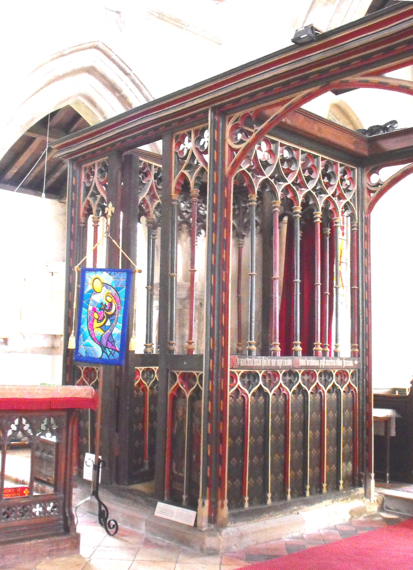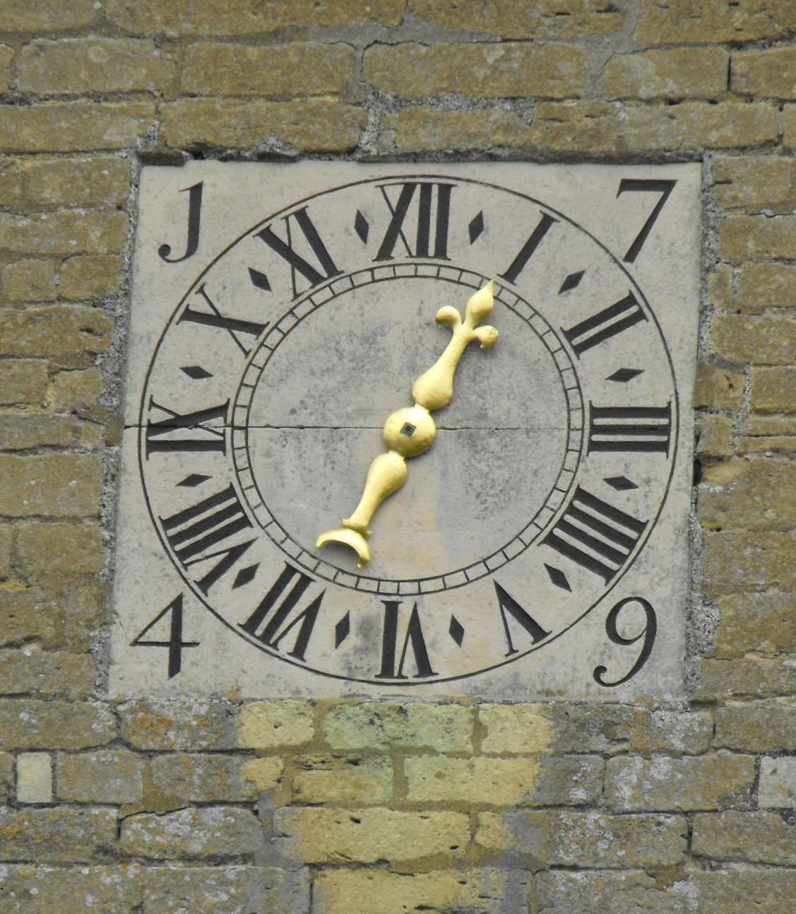 Furnishings in the church do not amount to much, with one or possibly two, exceptions. The lesser of these is the font, with a circular bowl that is almost certainly Norman, with nailhead decoration in a spiral round the rim. The major item, however, is the rood screen, though whether it is as special as the notes in the church suggest, which claim it to be unaltered except for the removal of the loft, seems doubtful. (The northern section is shown below left, viewed from the southwest.) Rather, Pevsner may have had the measure of it when he declared it to be reassembled from the original rood screen and one or more parclose screens, to form 'a double rood-screen, i.e. with a kind of pew left and right of a central passageway. Three designs are represented, two very similar and clearly not too late in the fourteenth century, the third, early Perp.' In fact, the early Perpendicular work forms the back of the screen and the re-used sections of parclose screens, if that is what they are, appear to have been built up against it on the side towards the nave. The tower clock, however, is a most excellent survival, dated 1749 and of the very early type with a single hand. (See the photograph, below right.)