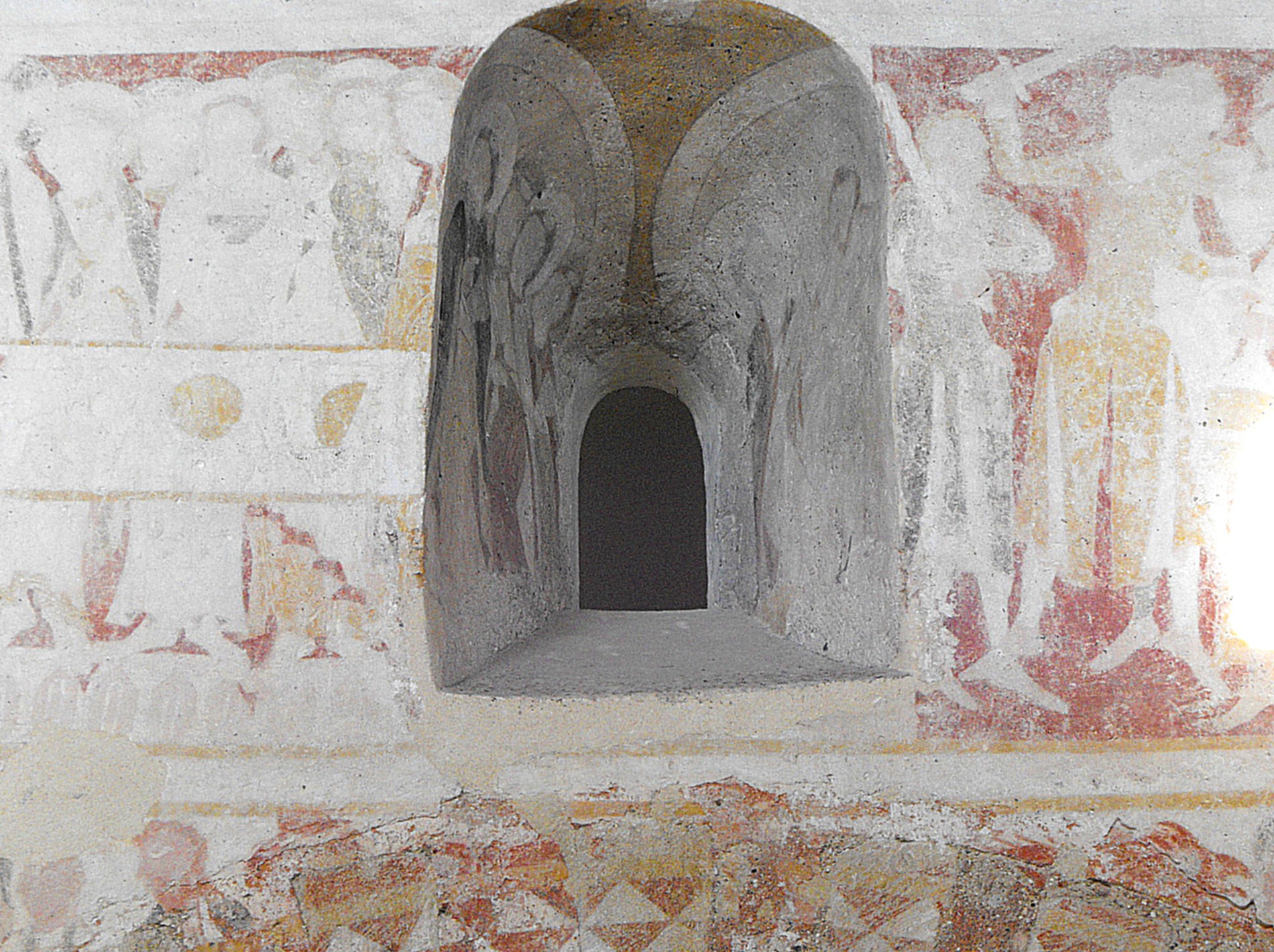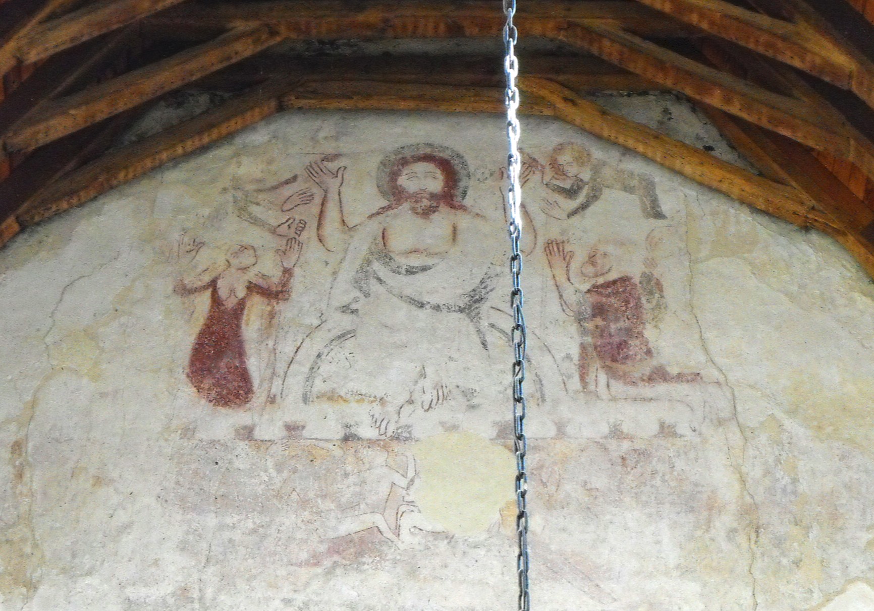 Turning back to the nave, it should be noticed how narrow it is: it is significantly narrower than the S. aisle, and barely double the N. aisle, which is a very cramped little thing indeed. Since the western part of the N. aisle wall is itself Norman, it is possible to envisage the original dimensions of the church, when the S. aisle was of equal width on the other side. This was thus a much less spacious building in the twelfth century than it is today, and a much gloomier one too, for above the apices of the nave arcades are the little round-headed windows of the former clerestory that once looked out above the aisles and supplied their meagre contribution to the church’s internal lighting. Above these again, arranged determinedly out of synchronization, are the five pairs of circular windows (set, internally, in pointed splays) of its Gothic successor. These are of no great interest, but on the N. side, around the Norman clerestory windows below, one positive effect of the fire can be seen in the form of the large areas of wall painting, contemporary with the arcades, that were only revealed when the church was thoroughly cleaned afterwards. These are illustrated in the church guide and interpreted as, above, scenes from the Passion (specifically, the Last Supper, the Betrayal, the Flagellation, and Christ carrying the Cross), and, below, from left to right, the martyrdoms of SS. Peter, Andrew and Laurence. They are inevitably in poor condition but their age ensures they are important survivals. The 'Doom' painting high up above the W. crossing arch is two or three centuries younger. (The photograph below left shows part of the scene of the Last Supper, left of the Norman clerestory window, and part of the scene of the Betrayal on the right. The photograph below right shows the best preserved part of the 'Doom' painting over the chancel arch.)