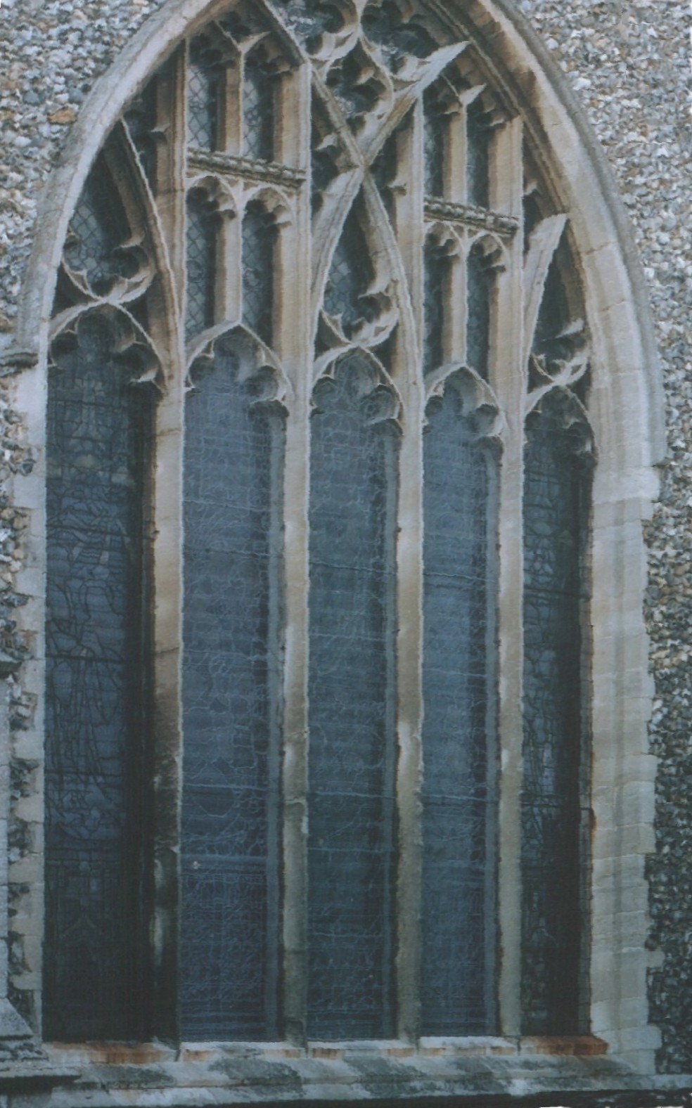 The Perpendicular work at St. Andrew’s includes the S. porch, the nave above the aisle arcade capitals, and most of the building’s windows, notably the three-light, four-centred ones with supermullioned tracery comprising the clerestory. These are noticeably much finer than the three-light untraceried windows in the N. aisle, which are Perpendicular certainly, but which appear to have been inserted some years earlier, at a time when funds were more limited. The S. aisle has two, three-light supermullioned windows east of the porch, with supertransoms above the central lights and inverted daggers above lights 1 & 3. (See the glossary for an explanation of these terms.) The S. aisle, S. transept and nave to the south are embattled, whereas the N. aisle, N. transept and nave to the north are topped with plain parapets. The S. transept windows now have supermullioned tracery and are three-light to the east and south and two-light to the west. The restored, five-light chancel E. window (illustrated left) displays intersecting subarcuation with through reticulation, with inverted daggers above lights 1, 3 & 5, castellated supertransoms above lights 2 & 4, and a group of four daggers in the window apex above light 3.