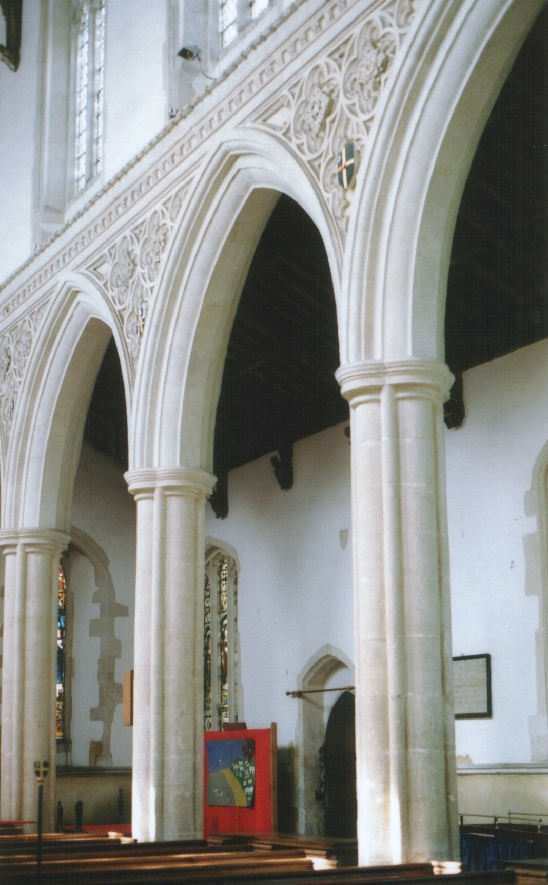The chancel, vestry, aisled nave and S. transept, including the arcades to the height of the springing but now only a few of the windows, are part of the main reconstruction that appears to have taken place c. 1330, a date deduced from the Rochester Diocesan Registers (sic), which record that, 'In 1331 Hamo, Bishop of Rochester, on Saint Luke’s Day, dedicated the church at Isleham, where he had rebuilt the chancel at his own expense, and, by the request of the monks of St. Edmund’s, held an ordination there on the Ember Day in Advent'. The chancel retains two original, over-large, two-light windows to the north and three to the south, all with reticulated tracery. The piers of the five-bay aisle arcades are formed of four major and four minor shafts: this is probably early fourteenth century work but, pace Pevsner (The Buildings of England: Cambridgeshire, Harmondsworth, Penguin, 1970, p. 414), the arches of two orders above, bearing sunk quadrant mouldings, seem more likely to belong to the remodelling. The easternmost bay on each side communicates with the transept rather than the aisle, and the westernmost bay to the south appears to have been blocked off from the outset to form a priest’s chamber. The chancel arch is similar to the arcade arches (but obviously taller), as is also the arch from the N. aisle to the N. transept. However, the arch between the slightly narrower S. aisle and the S. transept bears two hollow chamfers carved at intervals with fleurons, and dies into the jamb to the south. It seems possible this was the original form of the arcade arches.