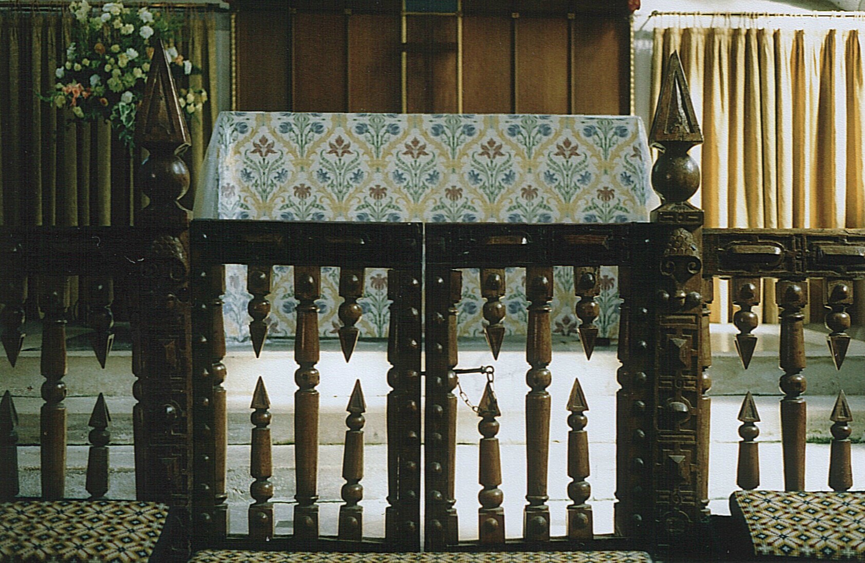 Some of the church furnishings must be described next. There is a piscina in the southeast angle of the chancel and a sedilia to the west, now undivided into bays, while of woodwork, there are several return stalls with misericords beneath the chancel arch, and the S. door ascribed to 1670. The seventeenth century communion rails (illustrated below) are best described in Pevsner’s words: they are, 'full of character [with] alternating turned balusters and a kind of stalactite and stalagmite forms nearly but not quite meeting. [There are] little pyramids on finials on the top rail' (ibid).