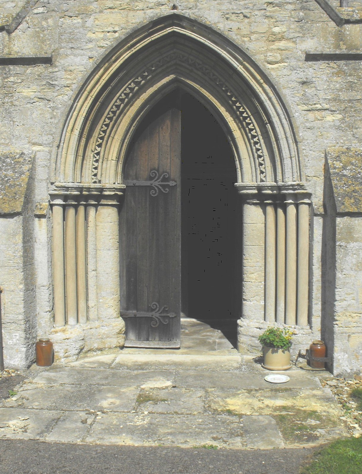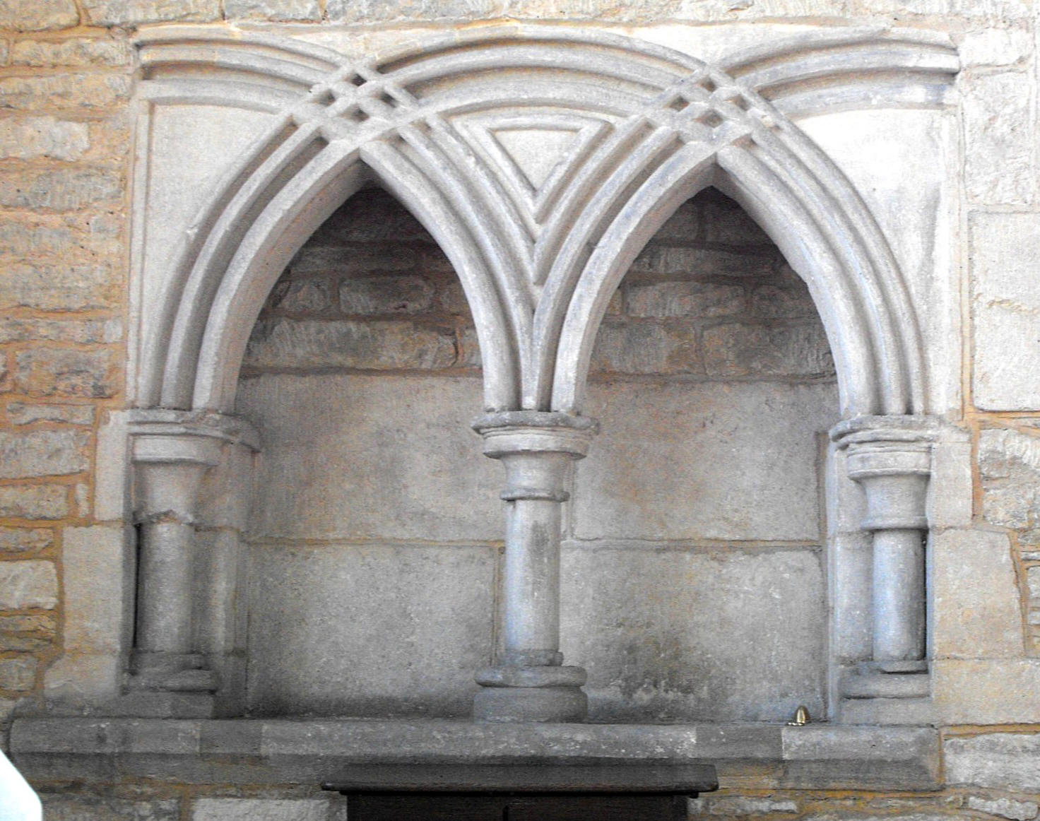 Indeed, Herbert's visits to Leighton Bromswold seem to have been very few indeed. He installed a curate and even sent his clerk to act as proxy for him at his institution. Certainly he would not have been encouraged on the first occasion when he did eventually visit, to find the church in a semi-derelict condition. It consisted then of a mid-thirteenth century nave with narrow aisles, a long chancel in late thirteenth century style indicating it had been enlarged just a few decades later (see as evidence, the gable line of its previously lower roof, inside the chancel, above the chancel arch), and N. & S. transepts apparently added another thirty or forty years after that. Work remaining from these building phases may by found, in the first case, in the N. & S. porch outer doorways, in the second case, in the three-light N. & S. windows with intersecting tracery in the chancel, and in the third, in the four-light E. windows with squashed reticulated tracery in the transepts. (The S. transept E. window is illustrated below left.) The most interesting work from these times is the porch outer doorways, for they are probably in situ, having been left behind, as it were, when the aisles were demolished just before or in the course of Herbert's restoration. This is the explanation for the shallowness of the porches. The N. doorway is double-flat-chamfered above two orders of colonnettes but the (admittedly restored) S. doorway (illustrated below right) boasts four orders of colonnettes and a complex series of mouldings around the arch, including a line of dog-tooth. As for the evidence of the former aisles, this can be found, externally, in the remnant of a gable-line against the west wall of the N. transept, and internally, in the surviving E. responds of the erstwhile arcades, one on either side of the double-flat-chamfered and presumably contemporary chancel arch, rising from narrow triple corbel shafts with nailhead moulding below. The other notable Early English feature in the building is the admirable double piscina in the S. wall of the sanctuary (illustrated further down the page), formed of intersecting round arches rising from short colonnettes and which it seems reasonable to assign to the period of the chancel windows. There are several similar piscina in Cambridgeshire, of which probably the best is at St. Andrew's, Histon, in work dated c. 1275.