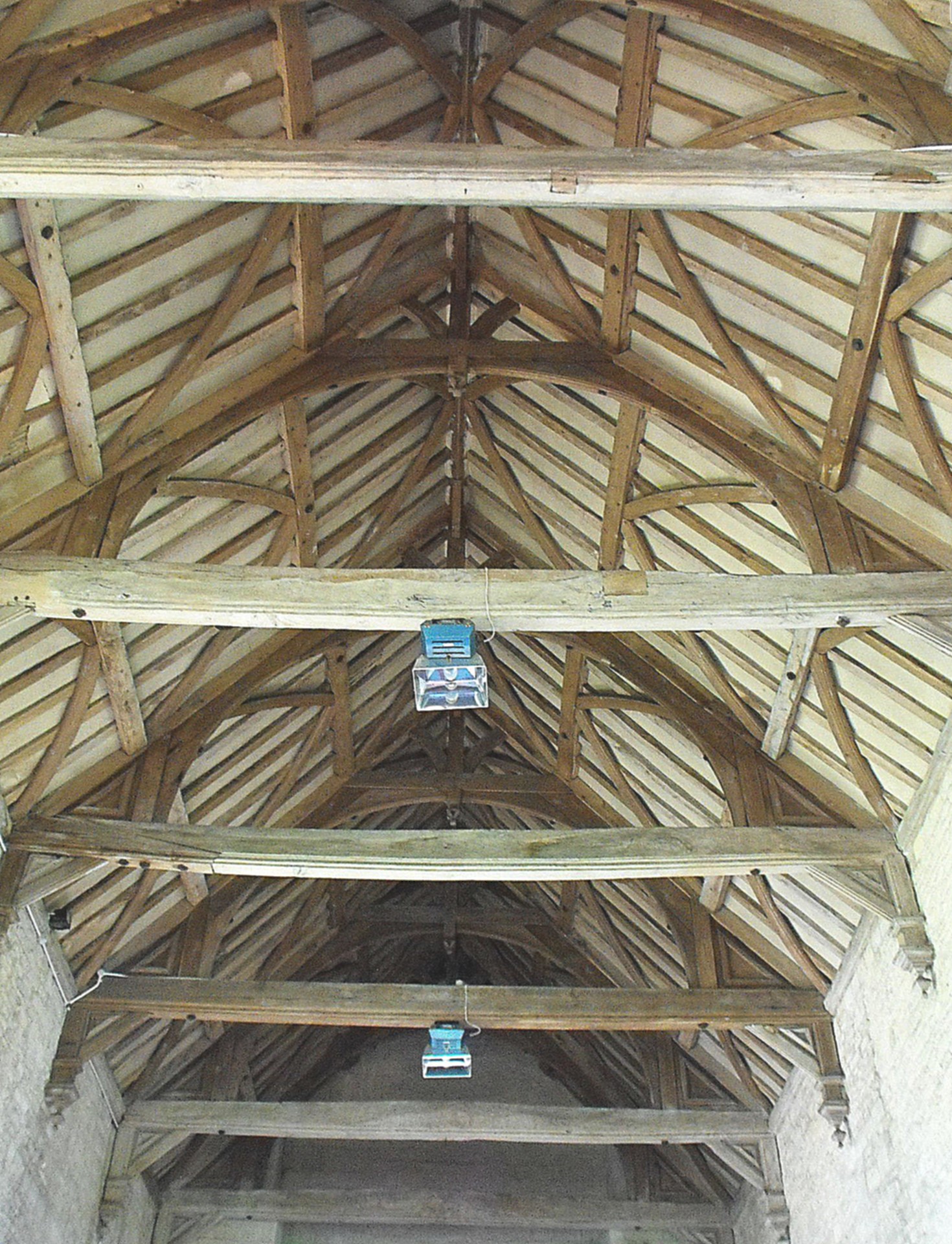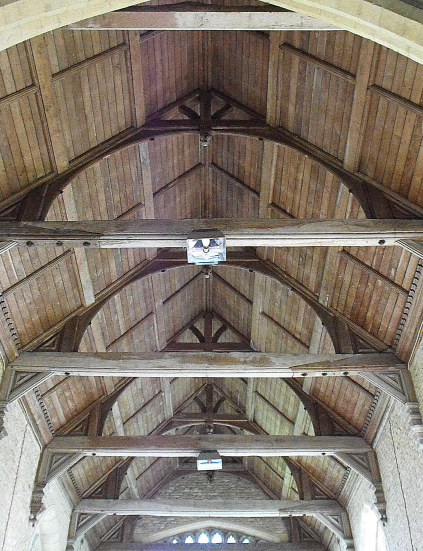 Herbert's work today is most evident in the building's carpentry, which is extensive. The nave, chancel and transept roofs all date from his prebendaryship, as do the twin pulpits with heavy testers (intended to function as a pulpit and prayer desk), one each side of the chancel arch, the front stalls in the chancel, the original benches in the nave (of which Hugh West says there are fourteen), and the low chancel screen, while all the more recent wooden furnishings are modelled on these. The roofs are all framed by arched braces rising from tie beams to collars, short struts with carved spandrels beneath the tie beams, rising from carved wall posts, and purlins at the ⅓ and ⅔ stages up the pitch, but the chancel roof is differentiated by a carved wall plate and the nave and transept roofs by wind-bracing in each of the three tiers. (The chancel roof is shown below left, looking east, and the nave roof below right, looking west.) It seems unlikely, therefore, that the chancel roof is precisely contemporary with the other three, or that it is the work of the same hand.