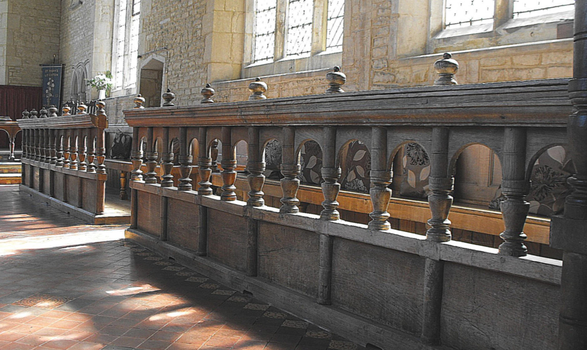The stalls and benches are characterized by top rails with protruding turned knobs, supported on open segmental arches between balusters, creating an effect which is both attractive and singular. (See the photograph below, showing the front chancel stall to the south.) The square pulpit and prayer desk are decorated by two tiers of blank arcading, each formed of two bays set forward on slender balusters, while the turned knobs now occur as pendants, hanging down from the testers above.