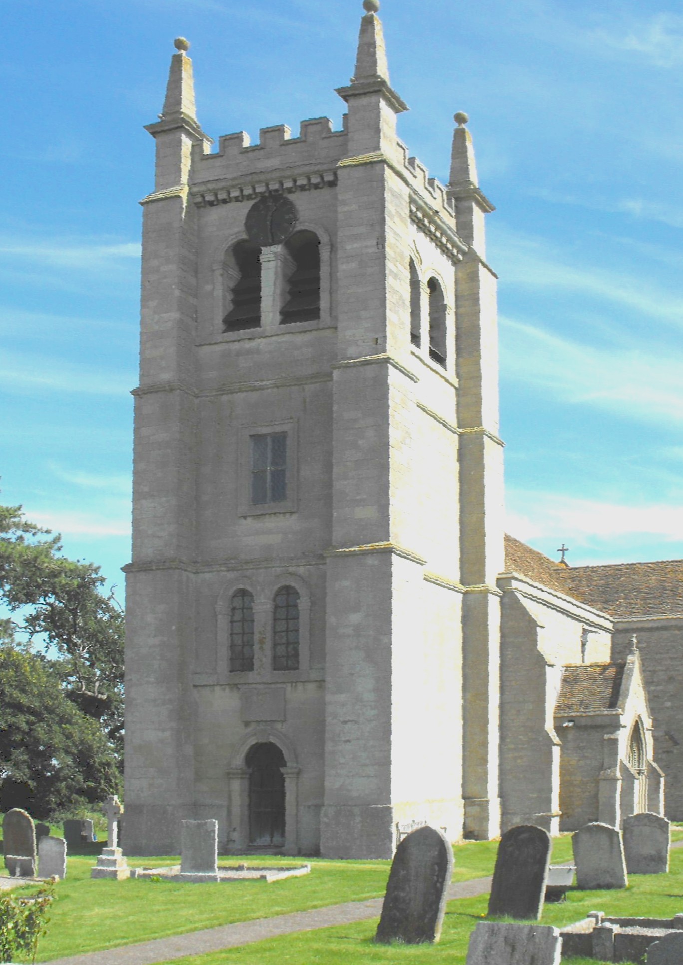 John Drury speculated that Inigo Jones (1573 - 1652) might have 'had a hand in the design of the tower [because it] bears the marks of the austere, classical clarity of his Queen's House at Greenwich' but there really is no evidence for this and all one can truly say is that it may have come under the influence of Jones's style at second hand. The parapet bears the date 1641 and the initials 'R.D.', which Hugh West believes may refer to Richard Drake, a friend of Nicholas Ferrar, who presumably made some important contribution to the work to earn such recognition. The tower rises in three slightly diminishing stages, supported by heavy clasping buttresses, to shallow battlements running between corner pinnacles in the form of obelisks topped by ball finials. The bell-openings consist of two plain round-headed lights each side; the W. doorway is also round-headed, this time with a keystone, and there are two round-headed windows above. George Herbert was dead before work on the tower had even begun and it appears it was paid for by the Duke of Lennox, who was Lord of the Manor.