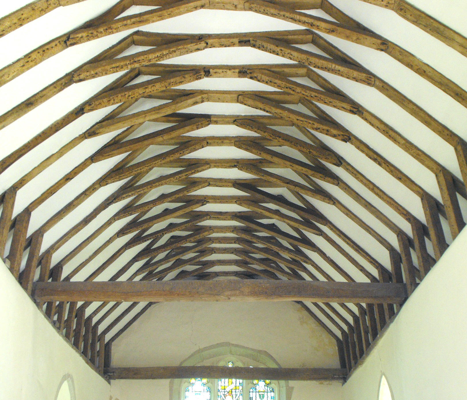 Church furnishings are not of much interest, but he best item by far is the collar-beam chancel roof (shown right), framed in seven cants, which probably dates from the fourteenth century. The hammerbeam nave roof is modern. The dropped sill of the easternmost S. window to the chancel provides what passes for a sedilia and there is the simplest of piscinas a little further east. The font, decorated only by pointed quatrefoils on the faces on the octagonal bowl, now appears to stand on a little cut-down stem.