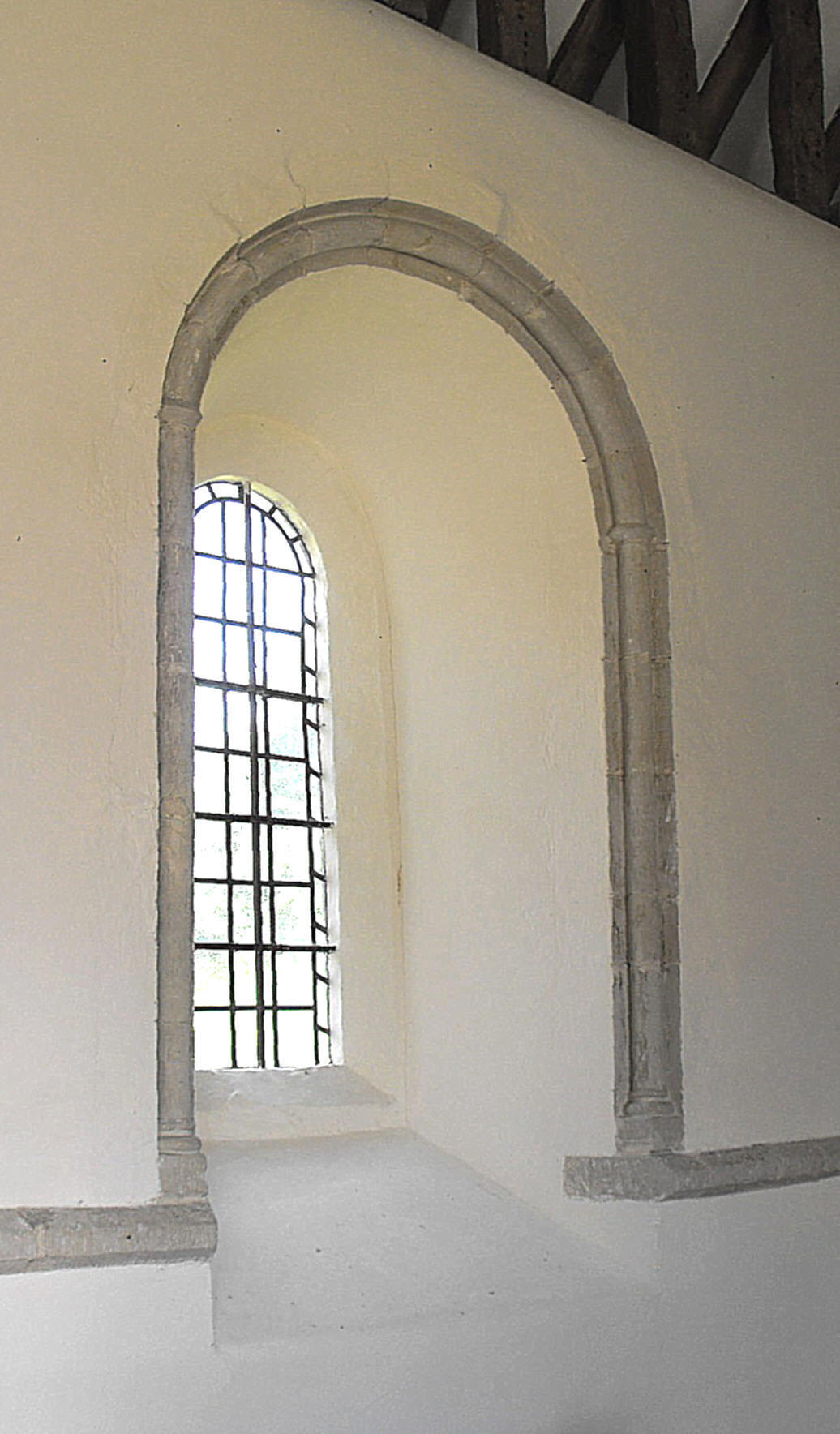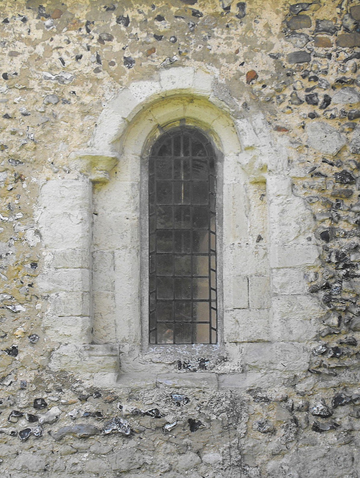 This is an attractive little building in a deeply rural position. Composed of a chancel, a nave with a S. porch, and a short W. tower, it is the humble combination of clunch and flint rubble walls with orange-brown tiled roofs, including the pyramidal roof to the tower, that give it its particular charm. The western half of the chancel is Norman, as shown by a round-headed N. window (illustrated below left) with a little flat-chamfered order round the head, which was once supported by an order of shafts. Internally, the window has a roll around the rere-arch and diminutive shaft-rings at the springing level (as seen below right). The Y-traceried window further east in the same wall witnesses the eastward extension of the chancel about a century later although the window directly opposite (i.e. in the S. wall) has renewed reticulated tracery, while the window to the west of that (seen left of the priest's doorway in the photograph at the top of the page) is formed of a renewed pair of trefoiled lights set above a recessed arch holding a stone coffin. The nave windows have all been renewed but the blocked N. doorway is Perpendicular, in common with the S. doorway inside the porch, with traceried spandrels decorated with encircled quatrefoils and little daggers. The unbuttressed tower rises in two stages to two-light, segmental-pointed bell-openings in Tudor brick to the north and south only, lit from the west by a renewed window. The S. porch has a very worn outer doorway of carved clunch, which unusually, however, appears to have been given the same decoration on its internal face, preserving its original form: the arch was composed of two keeled orders springing from two orders of engaged shafts, the spandrels were filled with quatrefoils in circles and little daggers, and the whole was framed by a wide rectangular hollow. The two-light porch windows are set within in the central bays of four-bay blank panelling that continues below the sills.
