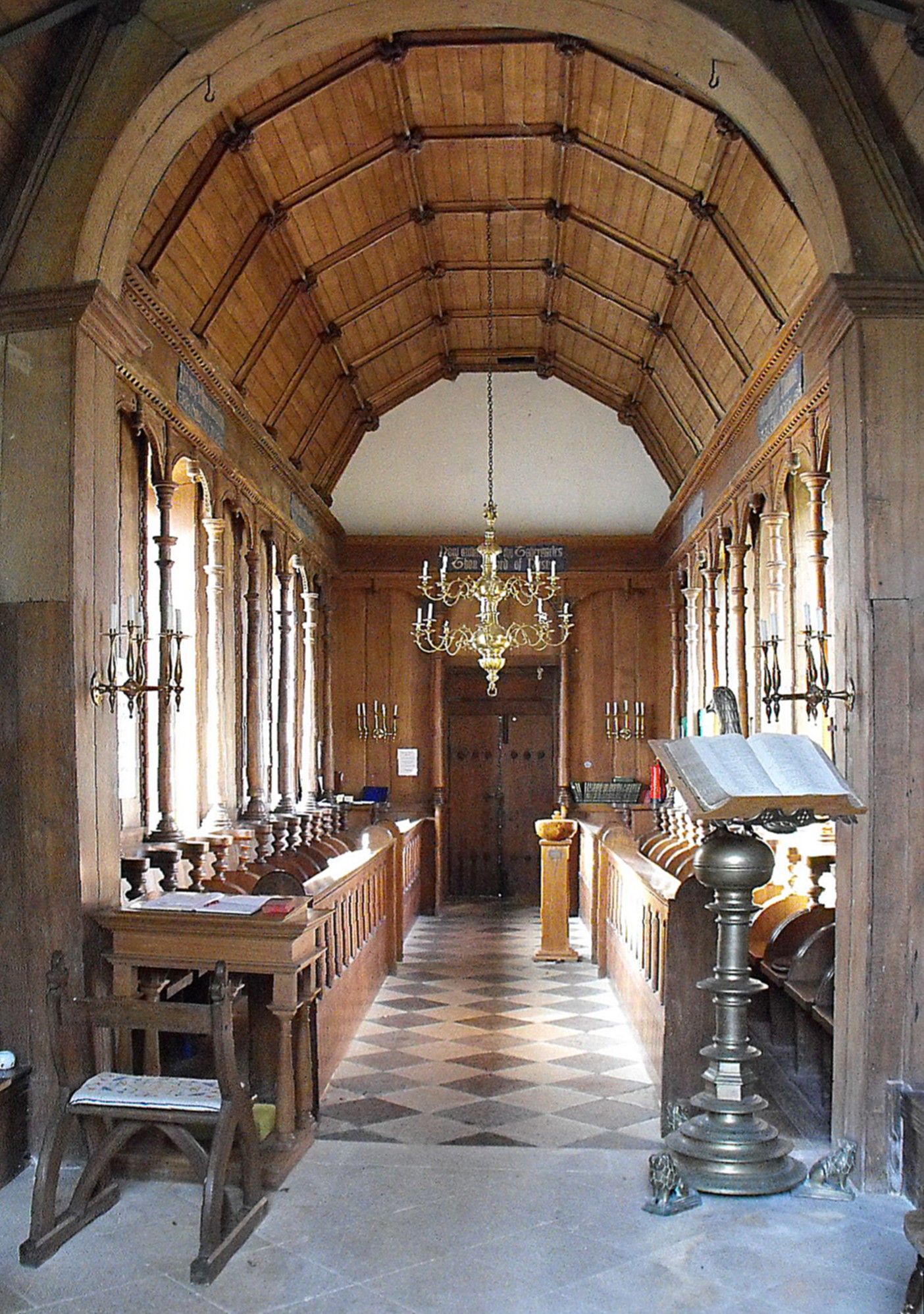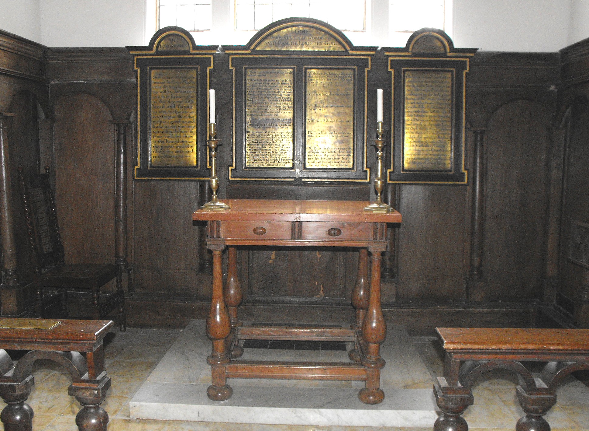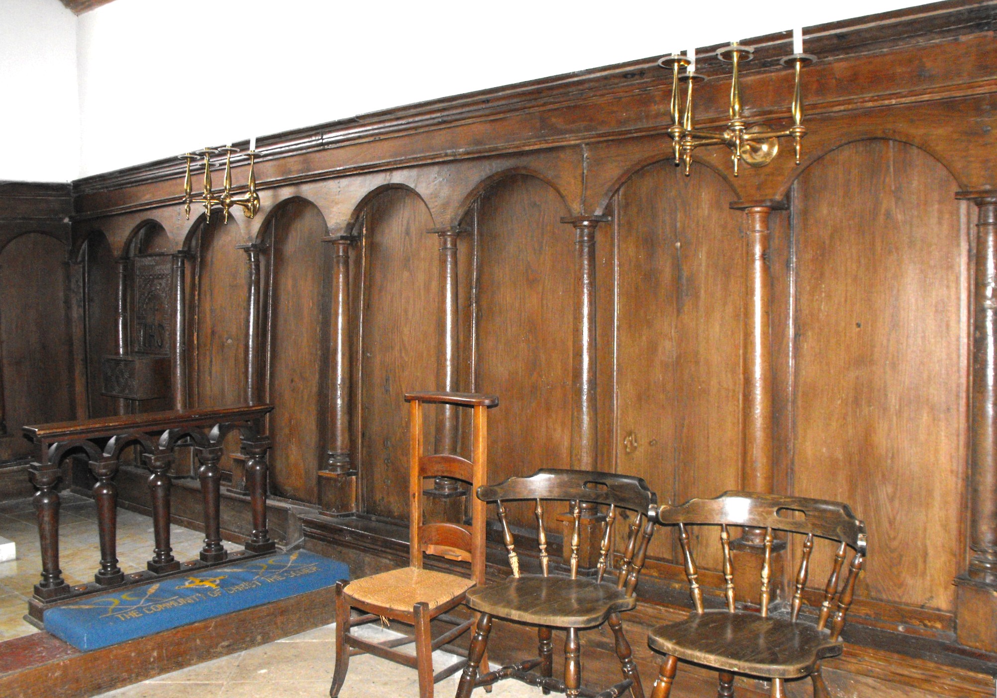 The interior of the chapel is more interesting than the exterior. (See the photographs showing the internal view looking east, above left, and west, above right.) The seating is arranged as in an Oxbridge college chapel, and the stalls and stall fronts in the nave appear to be Victorian. The rest is more problematic. The impressive woodwork around the nave windows and pairs of blank bays in between, consists of a decorative cornice above a row of segmental arches supported on elegant, detached balusters, while the dado around the chancel adopts a simpler but related design, with panelling fronted by detached arches supported on slender tapering balusters (as illustrated in the photograph below). All this is ascribed to 1714 on the britishlistedbuildings web-site, but is that the case? Pevsner appeared to try to keep a foot in two camps by saying they 'may well be of 1714' but adding 'in imitation to a certain extent of the time of Nicholas Ferrar'. The chancel arch is also panelled in wood, both down the responds and around the arch itself, which bears the inscription, '[O] Pray for the peace of Jerusalem' (Psalm 122, v. 6a). The reredos (illustrated at the foot of the page) is formed of a triptych framing brass panels inscribed with the Lord's Prayer (left), the Creed (right), and the Ten Commandments (centre). The panels, at least, are seventeenth century work.