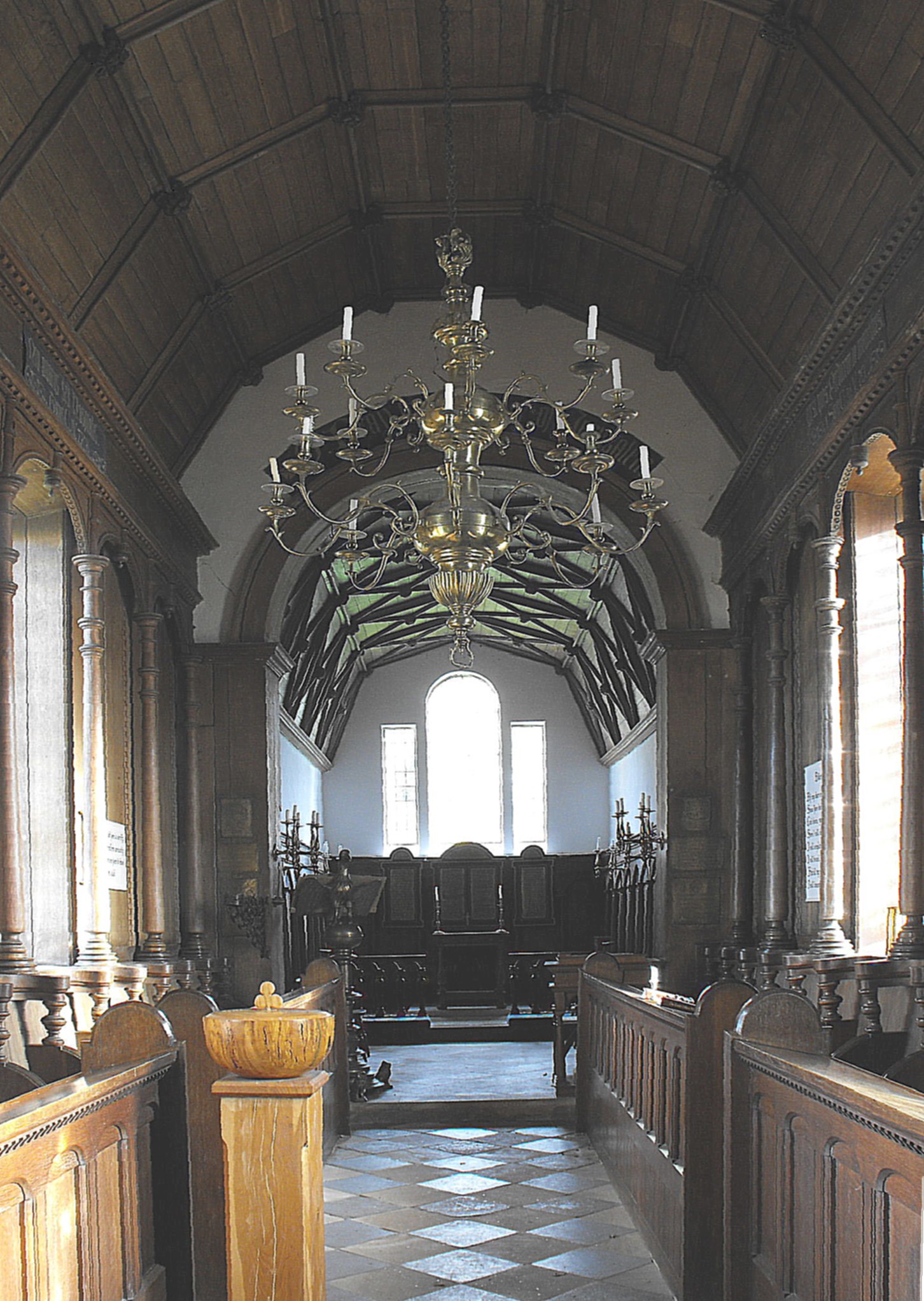 So is the communion table, but it is difficult to know what to make of the attractive wagon roofs to the nave and chancel, the former framed in five cants and the latter, in four. They appear at least partially renewed but attributing their design seems precarious and both Pevsner and the britishlistedbuildings website were/are probably wise not to attempt it. They may be Victorian for the vestry roof is also ceiled in wood panelling, in somewhat similar fashion, but the roof at the Queen's Chapel provides an excellent, more elaborate model of the same form.
