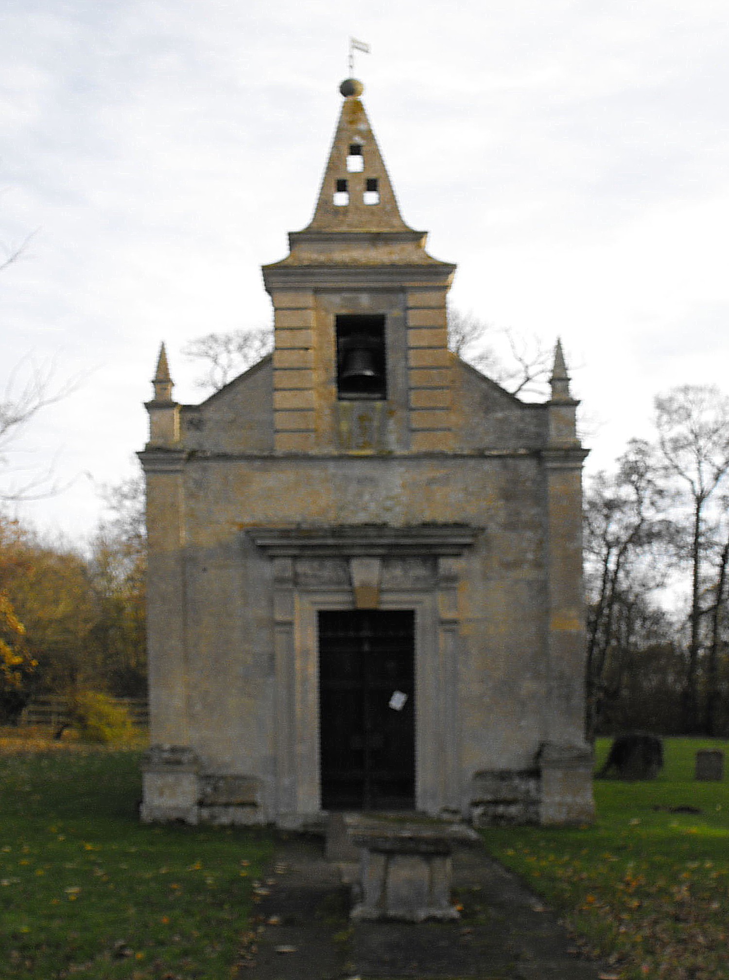 St. John's chapel today is a confusing mix of the original seventeenth century work, a partial early eighteenth century reconstruction, and a more than usually scrupulous nineteenth century restoration. The exterior is generally considered to be dated by the numerals '17' and '14' carved on the obelisks above the corners of the W. front, but perhaps it was reconstructed in the original style: the Palladian style was not widely adopted in England until the 1720s, when it was promoted by Richard Boyle, third early of Burlington, and his architect Colen Campbell, and the Palladian E. window (illustrated above right) and the form of the west doorway (above left) at Little Gidding seem more indebted to the earlier, lone example of Inigo Jones (1573 - 1652), notably at The Queen's Chapel, St. James's Palace, erected 1623-7. The W. doorway at Little Gidding is topped by a cornice borne on large corbels, above the text 'This is none other but the house of God, and [this is] the gate of heaven' (Genesis ch. 29, v. 17b). The W. front as a whole rises between angle pilasters to a gable enclosing a bell-cote with short rusticated pilasters and surmounted by a pediment pierced by three rectangles and crowned by a ball finial. It is constructed entirely of stone, although the other walls are of brick with Ketton stone dressings (britishlistedbuildings website). The N. & S. windows are plain rectangles with patently non-structural keystones in the centres. The vestry was probably added in 1853 by Henry Clutton (1819-93) (Pevsner): the Flemish-bonded brickwork is virtually indistinguishable from that around the rest of the building but the chimney is arguably the telling feature.