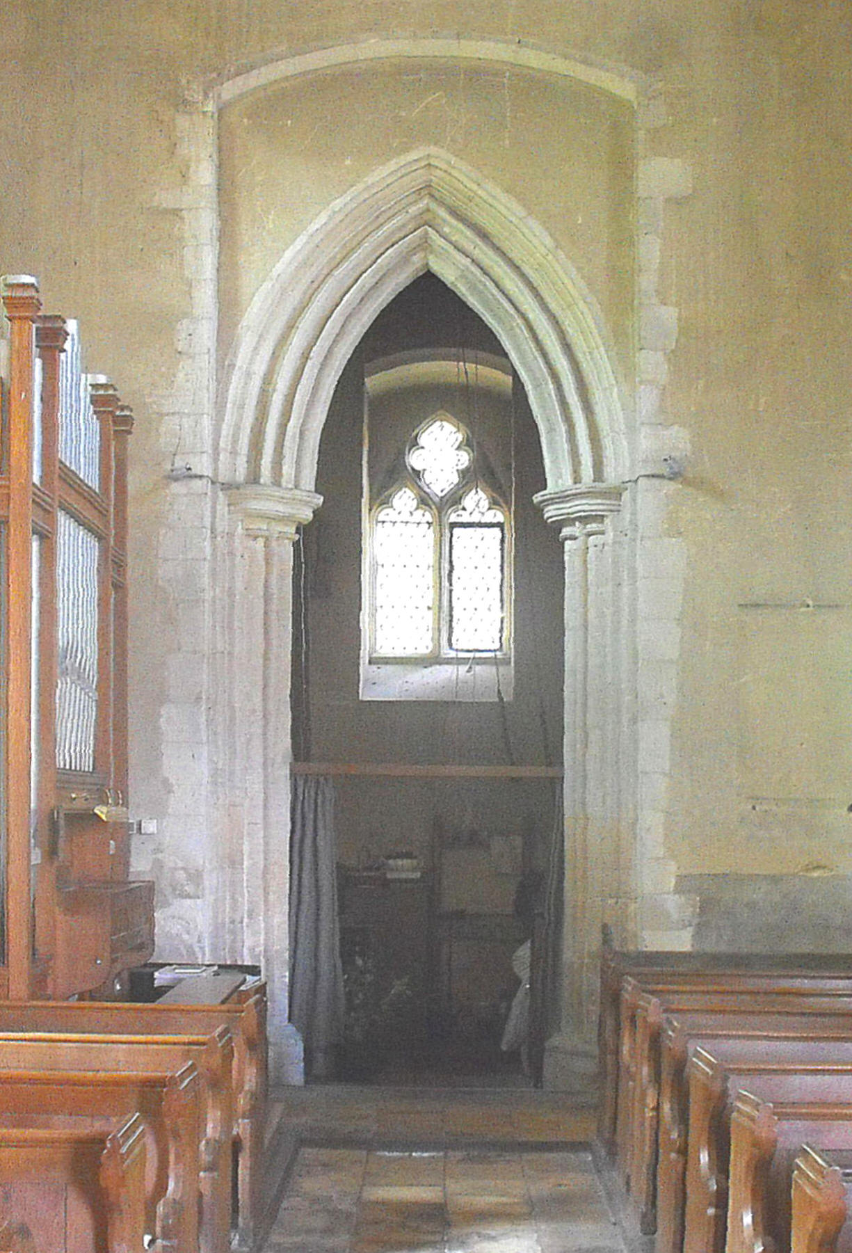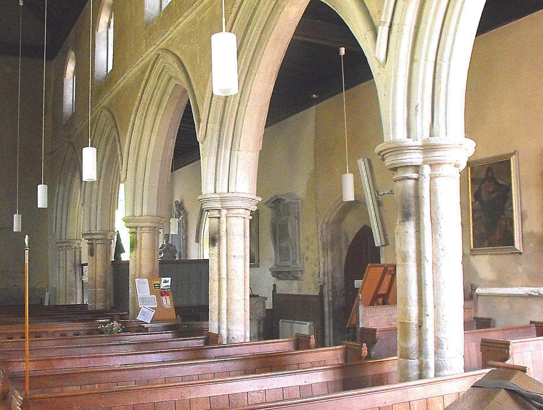 The tower is unbuttressed and rises in four stages to battlements and a slender surmounting spire, reconstructed in 1926 and lit by two tiers of gabled lucarnes in the cardinal directions. There is no W. doorway and the two-light W. window in the second stage has reticulated tracery. The tower arch to the nave (below right) springs from responds of similar section to the piers to the N. arcade, but the mouldings above are different and the arch itself is lancet-pointed and now set in a tall, blank, segmental arch - the probable result of fifteenth century alterations during which the wall was thickened. Other Perpendicular additions to the building include the N. porch with its unglazed two-light windows, the nave clerestory formed of five pairs of cinquefoil-cusped Y-traceried windows (i.e. they occur on the aisleless south side of the building as well as above the aisle to the north), three windows in the S. wall of the nave below, and the east and west windows to the aisle.