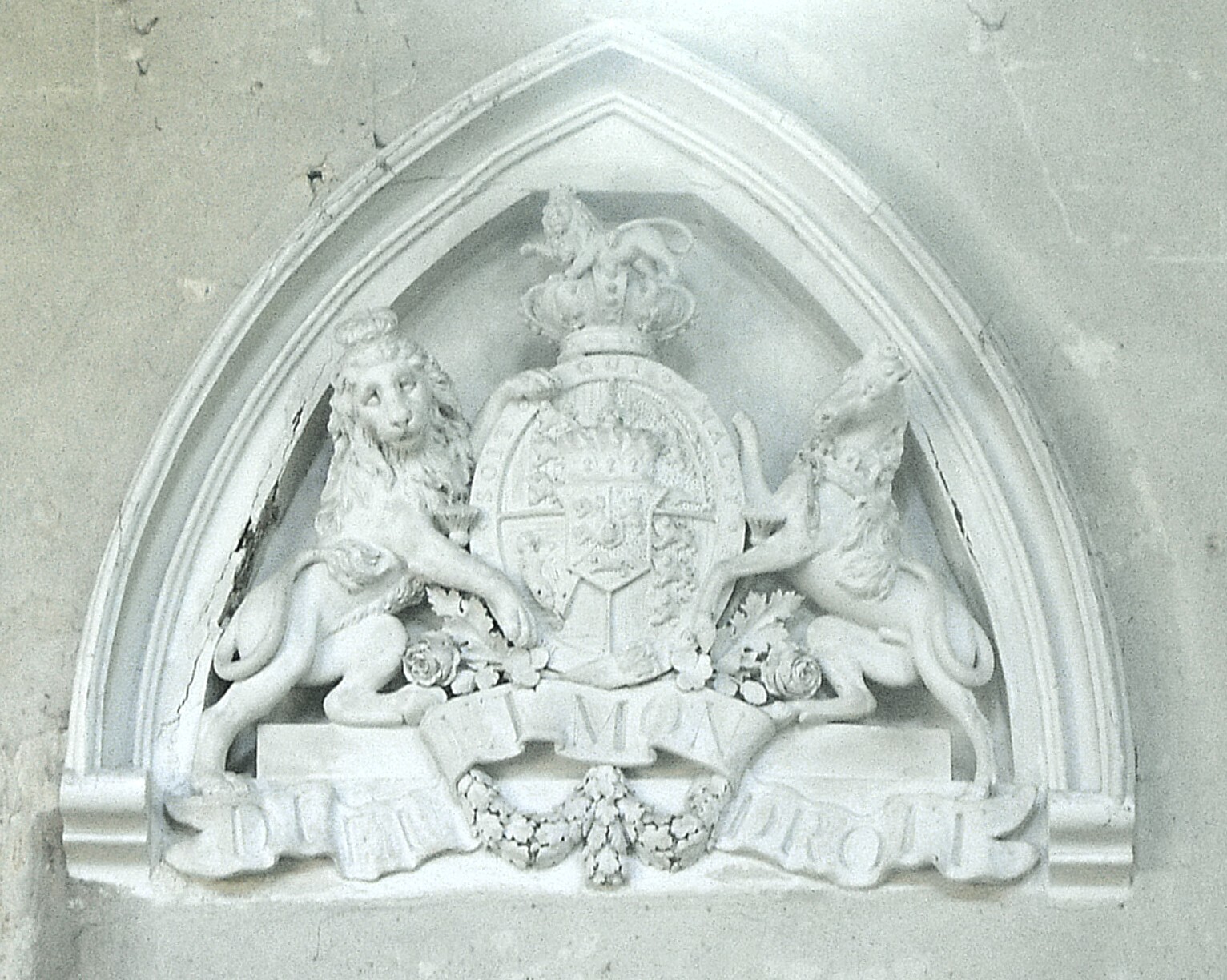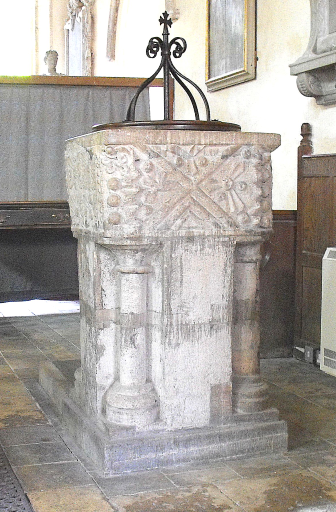 Furnishings and fittings inside the church include the unusual font (below left), formed of a square bowl standing on a square stem, albeit with the angles cut away to create spaces for nook-shafts. This defies confident dating and Pevsner wondered whether it might be 'C17 work trying to imitate the Norman style'. The royal arms of George III above the S. doorway is chiefly of interest for being made of artificial Coade stone from Mrs. Eleanor Coade's London manufactory, formerly situated on the site of the Royal Festival Hall. This material, whose composition has only recently been rediscovered, permitted fine detail to be produced and has proved exceptionally durable.