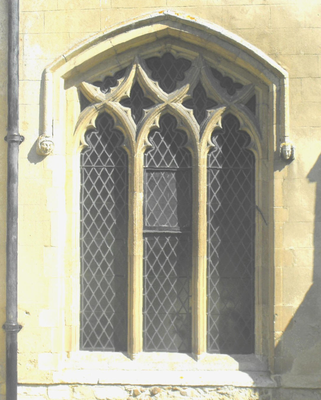 The N. aisle, now atrociously faced in masonry with 'crazy-paving' effect, is dated 'about 1300' in the church guide and 'early C14' by Pevsner, but the design of the arcade seems quite advanced, even for the latter time. It consists of arches bearing waves and quarter circle mouldings (they are not quite sufficiently sharply defined to be termed 'sunk quadrants'), supported on piers formed of four major and four minor semicircular shafts, with capitals going all the way round but with the annulets below around the major shafts only. (See the photograph above, looking southeast.) Piers of like form, probably deriving from the reconstruction of the church in 1331, can be seen at St. Andrew's, Isleham in this county, but arcades very similar overall to these at Madingley and close-dated to c. 1350, may be found fifteen miles to the southwest, at Ashwell in Hertfordshire. Many others seem to be later again, and Birkin Haward, in his comprehensive guide to the arcades of the churches of Suffolk (Suffolk Medieval Church Arcades, Hitcham, The Suffolk Institute of Archaeology and History, 1993, pp. 331 & 302), dated piers of this section at Rougham and Long Melford respectively to c. 1350 and c. 1380. The latter year may be too late for some of the window designs here however. The best is the easternmost S. window in the nave (illustrated below left), with three lights and drop tracery formed of intersecting ogees beneath a segmental-pointed arch. It may serve as the model of its type, which seems to have particular associations with Cambridgeshire. A two-light version of the design can be seen at St. Peter & St. Paul's church, Hemingford Grey.