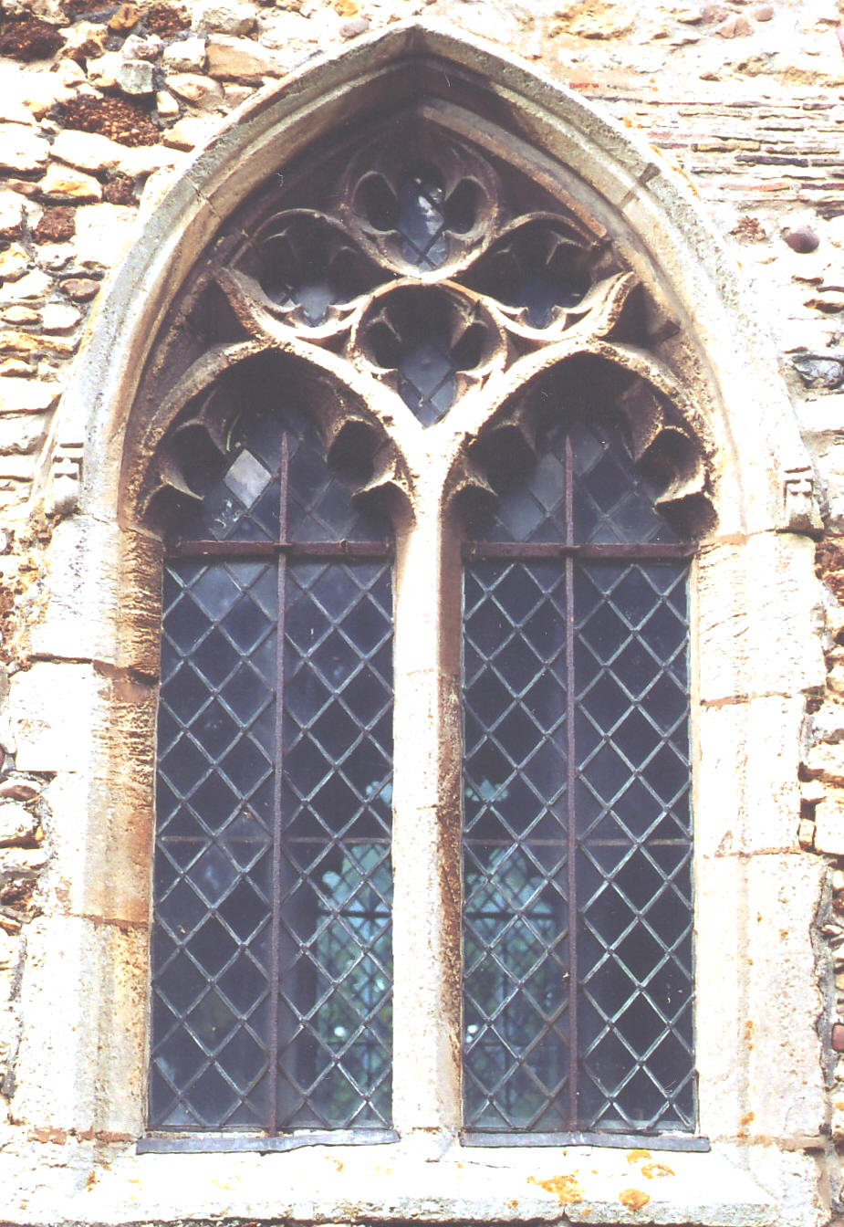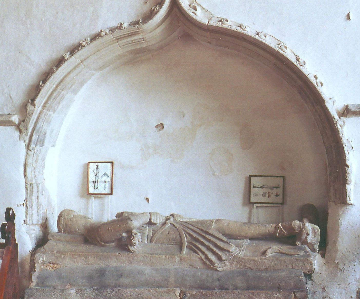 The tower cannot be much later than c. 1300, notwithstanding the arch to the nave, bearing wave mouldings springing from semi-octagonal responds with tall bases. It rises in three short, unbuttressed stages, lit by a (later?) two-light W. window with reticulated tracery in the first stage and a renewed lancet in the second, to a bell-stage with cinquefoiled one-light bell-openings and surmounting battlements. The three eastern bays of the arcade (shown above left, viewed from the northwest) are Decorated and probably follow next, being formed of double-hollow-chamfered arches springing from short octagonal piers with prominent capitals and broaches above, while the westernmost bay is a Perpendicular extension. The S. windows to the aisle are square-headed Perpendicular insertions but the short E. window is Decorated (as shown in the photograph at the top of the page, on the left), with trefoil-cusped lights and a squashed reticulation unit in the head. The nave N. wall is pierced: (i) east of the brick vestry, by a two-light window with a pointed quatrefoil in the head, followed by a square-headed one in Tudor-style; and (ii), west of the vestry, by a window like that in the S. aisle E. wall. However, the two windows on either side of the chancel are more interesting than any of these (see the S. window, illustrated above right) for above their cinquefoil-cusped lights, they display cruciform lobing set vertically, a fourteenth century design of which there are several examples in Suffolk. The five-light E. window with narrow reticulated tracery has been renewed, but the tracery shape is consistent with the S. aisle E. window, while above in the gable are the re-set portions of what appear to be Norman shafts. Inside the chancel, a Decorated tomb canopy, recessed in the N. wall (as shown below left), features a large crocketed ogee arch above a recumbent stone effigy of a knight drawing his sword from its scabbard and with his feet resting on a lion. The S. porch is constructed of English-bonded brick although the date is the eighteenth century when Flemish bond was more usual. (English bond is stronger than Flemish but is generally considered less economic as more facing bricks are required.) It has no windows and a couple roof.