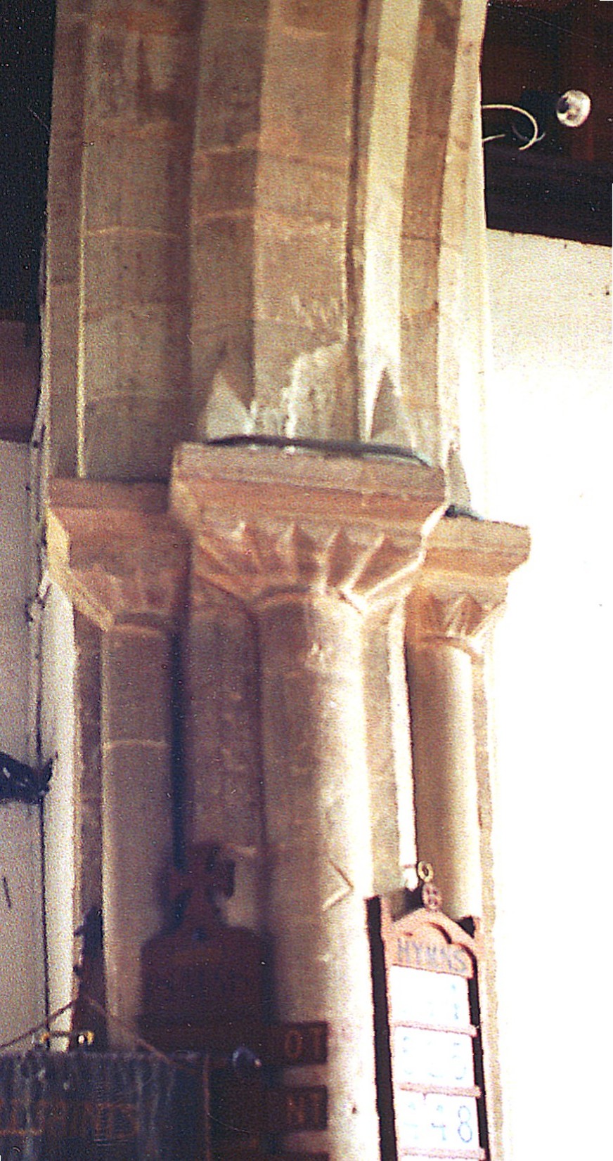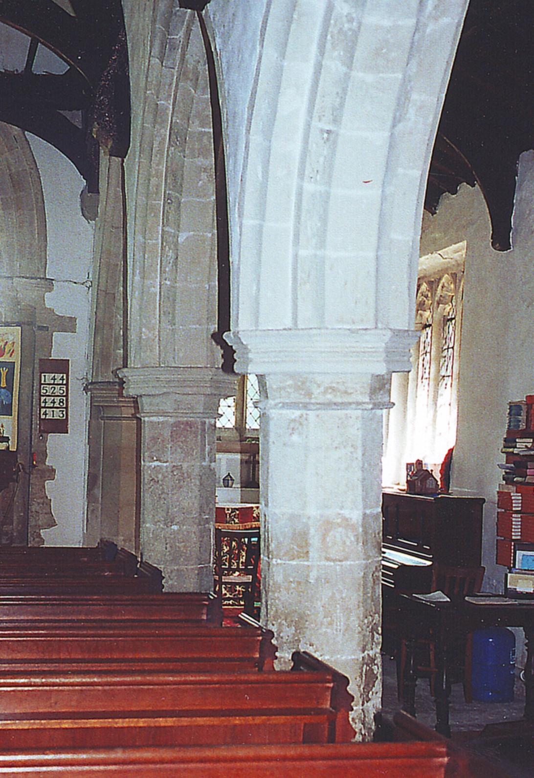 All Saints’ church consists of a chancel, a nave with a S. aisle and porch, and a short W. tower, and is constructed of rubble with limestone dressings with a tiled roof above the chancel, a slate roof above the aisle, and thatch over the steeply-pitched nave. The earliest work in evidence is a few fragments of Saxon carving, re-set internally in the chancel E. wall, but the oldest features of real significance are the Norman responds to the chancel arch, though probably only that to the north is in situ (see the photograph above right) as it is likely the arch was widened when the aisle was added, at which time the arch was also renewed above the springing and given its present flat-chamfered, pointed form, with telltale broaches resting on the projecting chamfered abaci. The responds are probably twelfth century work and replete on both sides (i.e. to east and west) with two orders of semicircular shafts, each with a scalloped capital.