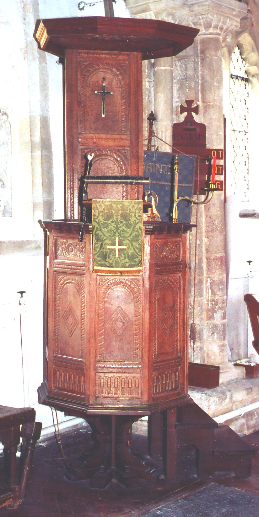 The nave roof is of makeshift queen-post construction, which like the roof at Willingham, appears to have been altered or cut down: the queen posts rise from damaged tie beams to purlins halfway up, which are connected by braced collars at an uncommonly low level. A more comfortable height for these would surely be at the two-thirds position, yet the queen posts seem too slender to support the supposition that there was once a second pair of purlins below and that the roof has been reduced by a third. The pulpit (above right) is reputedly Elizabethan and forms an irregular septagon with five short sides round the front and two long sides at the back. The tester is supported on a tall backboard with two tiers of panels decorated with single round arches.