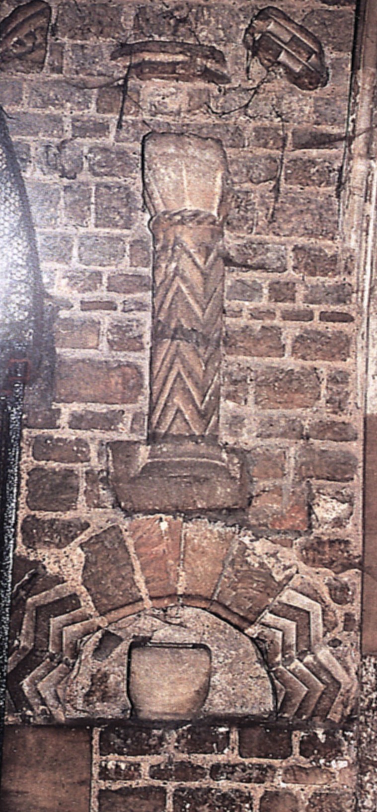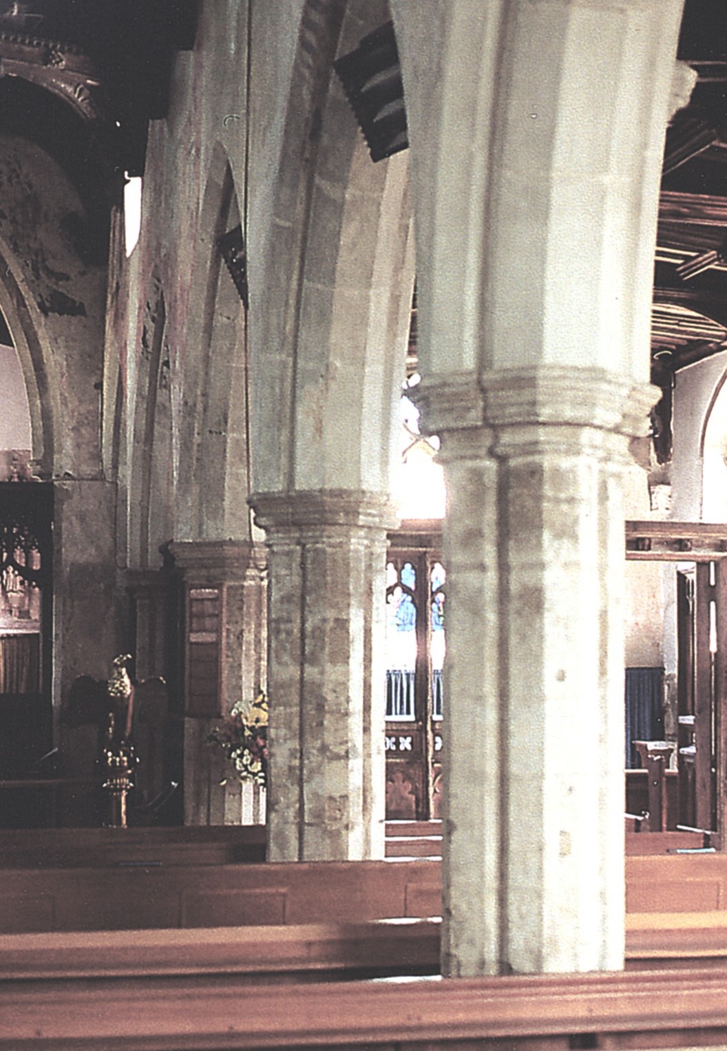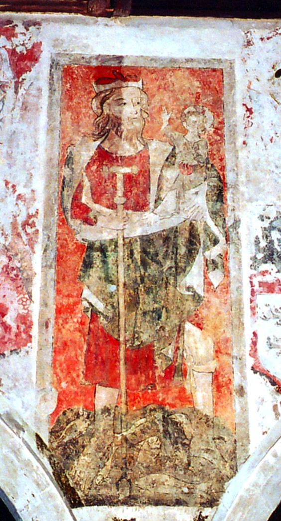 Finally, a note should be added on the other wall paintings in the church (aside from those previously mentioned on the splays of the S. aisle W. lancet), of which there are many mostly indistinct fragments but also a restored panel in reds and greens above the N. arcade (illustrated below right), showing St. Christopher carrying Christ across the river, with fish teeming round his feet. It is probably contemporary with the arcade and subject to the same considerations.