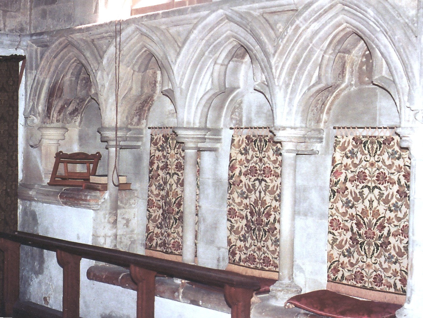 As for the screens, the fine, early fourteenth century parclose screen around the N. chapel, decorated on the dado with green parrots painted on a red ground, was considered by Pevsner to be one of the earliest in Cambridgeshire (The Buildings of England: Cambridgeshire, Harmondsworth, Penguin, 1970, p. 488). The screen around the S. chapel, which only retains traces of paintwork, is Perpendicular and features a row of carved faces and roses on the top rail, and the dado of the rood screen, which also appears to be original, has applied blank tracery forming two-light sections. The attractive but ill-designed pulpit, seems likely to be coeval and comprises an oddly irregular pentagon.