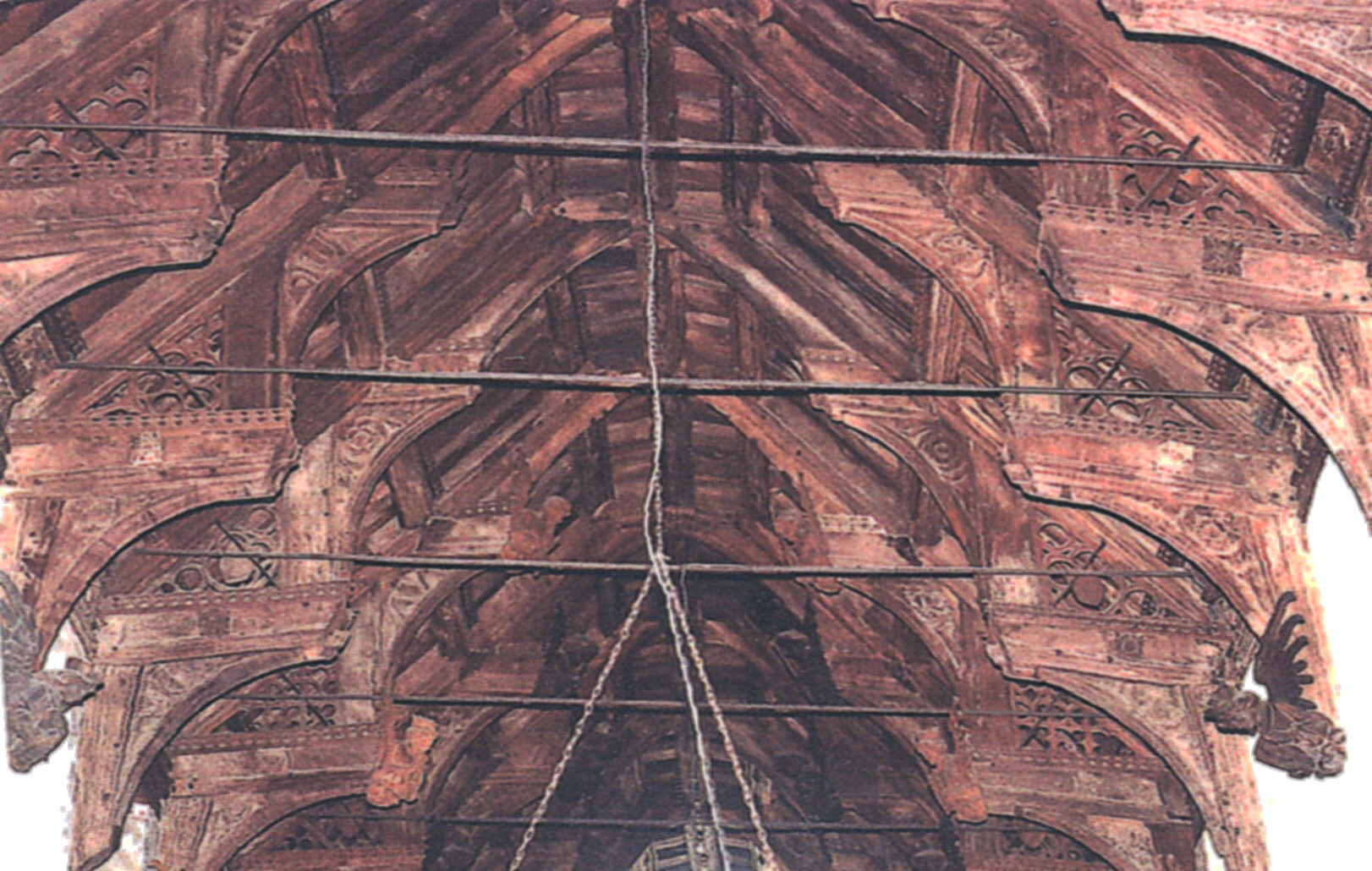 Church carpentry is important for both the over-timbered nave roof and the parclose screens enclosing chapels at the east ends of the aisles. The former (shown below) is of double-hammerbeam construction with castellated hammerbeams supported by arched braces with carved spandrels, and with open tracery in the triangles between the hammerbeams, rising struts and principal rafters. (The three tiers of angels are wholly renewed.) However, its curious feature is the complete lack of collars, which - while clearly not structurally necessary - gives it an incomplete appearance at the ridge (but see also the nave roof at neighbouring Rampton). That this may not have been the original arrangement is suggested by the tradition, recorded by Alan Fawcitt, that this roof was brought here in 1613 from the ruined priory at Barnwell, Cambridge, when it would probably have been necessary to cut it down to fit its new situation. Indeed, the extent of this cutting back may even perhaps be estimated to have been around 30% of the original, for the purlins one would expect to be at the ⅓ and ⅔ positions are now nearly halfway up the pitch of the roof in the first instance and only just below the ridge in the second. In consequence, by comparison with this, the equally heavy but more attractive aisle roofs, thought to have come from the same source, seem both to fit and look better.