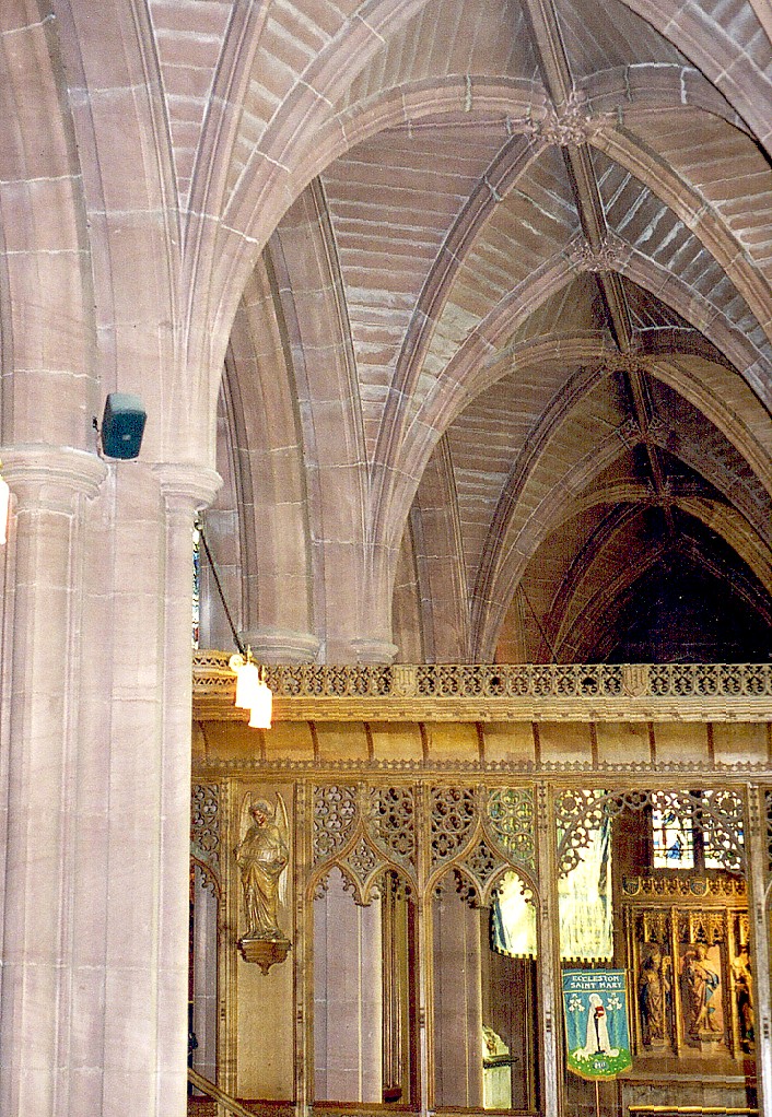 Inside the building, the heaviness of the structure is compensated for in some measure by the high sexpartite vaults covering the aisles, nave and chancel - especially the nave and chancel vault (shown above right, at the point where it passes from the nave to the chancel) which rises from short corbel shafts above the arcades. The arcades spring from tall compound piers with semicircular shafts towards the openings. That this fine work is nevertheless unable to lift the building sufficiently is due to the dark sandstone and the poor natural lighting, which together appear to conspire to pull the roofs down again, so that while the visitor can admire Bodley’s handling of his structures, it is difficult to avoid feeling that the sum of the parts remains distinctly oppressive.
