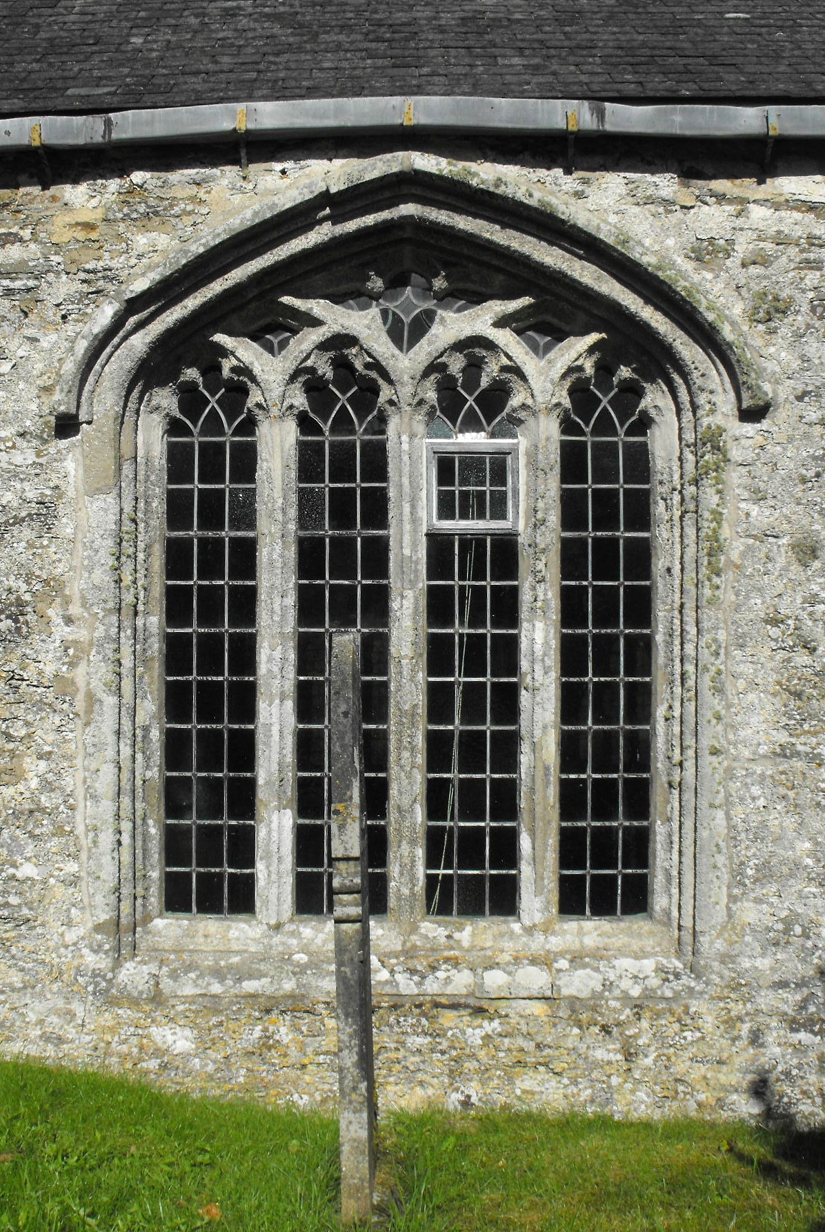 The tower rises in four broad, unbuttressed stages, to three-light, square-headed bell-openings and battlements. The renewed W. window scarcely looks out above ground level and the W. door is almost subterranean and approached down a flight of no less than eleven steps. The W. windows to the aisles are also at knee height and the walls below are kept clear of the rising ground by deep, narrow ditches. To the north and south, the aisles are lit by four-centred windows chiefly composed of four cinquefoil-cusped lights subarcuated in pairs, with small daggers beneath the subarcuations and larger daggers in the heads. (See the typical S. aisle window, illustrated above right.) The three-light S. aisle E. window and the renewed(?) E. window to the sanctuary display the more characteristic West Country alternate tracery (see the glossary for a definition of this term), with added subreticulation. The squat, windowless S. porch has a simple outer doorway bearing a single flat chamfer, but its important features, seen within, are the chamfered Norman jambs of the inner doorway, topped by abaci with chamfered under-edges (presumably survivals from an earlier building) and the well-constructed wagon roof, which anticipates the more impressive carpentry of the nave and aisles.