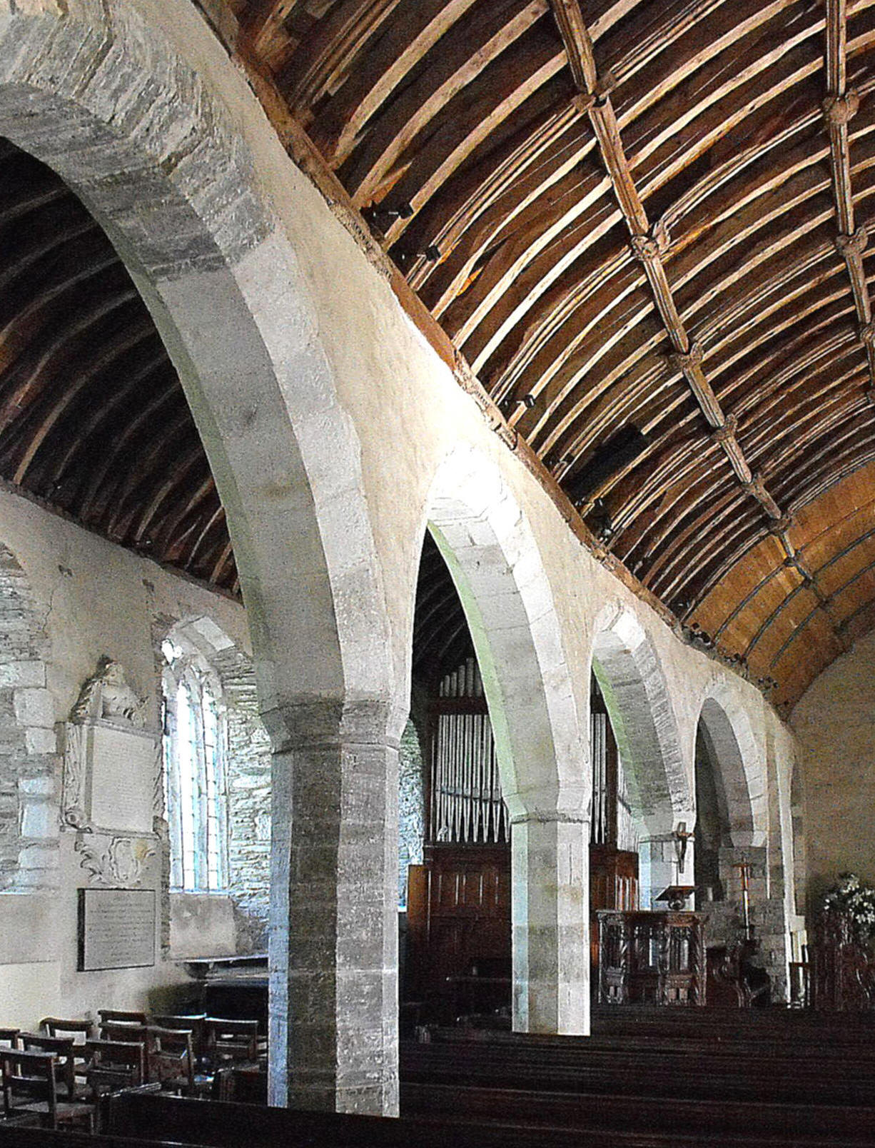 Inside the church, the aisle arcades are constructed in five bays, of almost round arches bearing a single wide chamfer, supported on relatively narrow octagonal piers with very modestly projecting capitals. (See the photograph, above, which shows the N. arcade viewed from the southwest.) This might almost be mistaken for Norman-Transitional work, although it is actually Perpendicular. There are no arches between the chancel and nave or the chapels and aisles, and so the position of the chancel (which begins between the fourth and fifth bays of the arcades) is defined only by its fittings and being raised up a single step. The tower arch is unmoulded but nook-shafts on the east side, rising halfway up the jambs, suggest its predecessor was Norman and low. Beyond, the aisles continue westwards for some distance, and arches open between them and the tower, the S. arch being formed of two unmoulded orders and its counterpart to the north, composed of three.