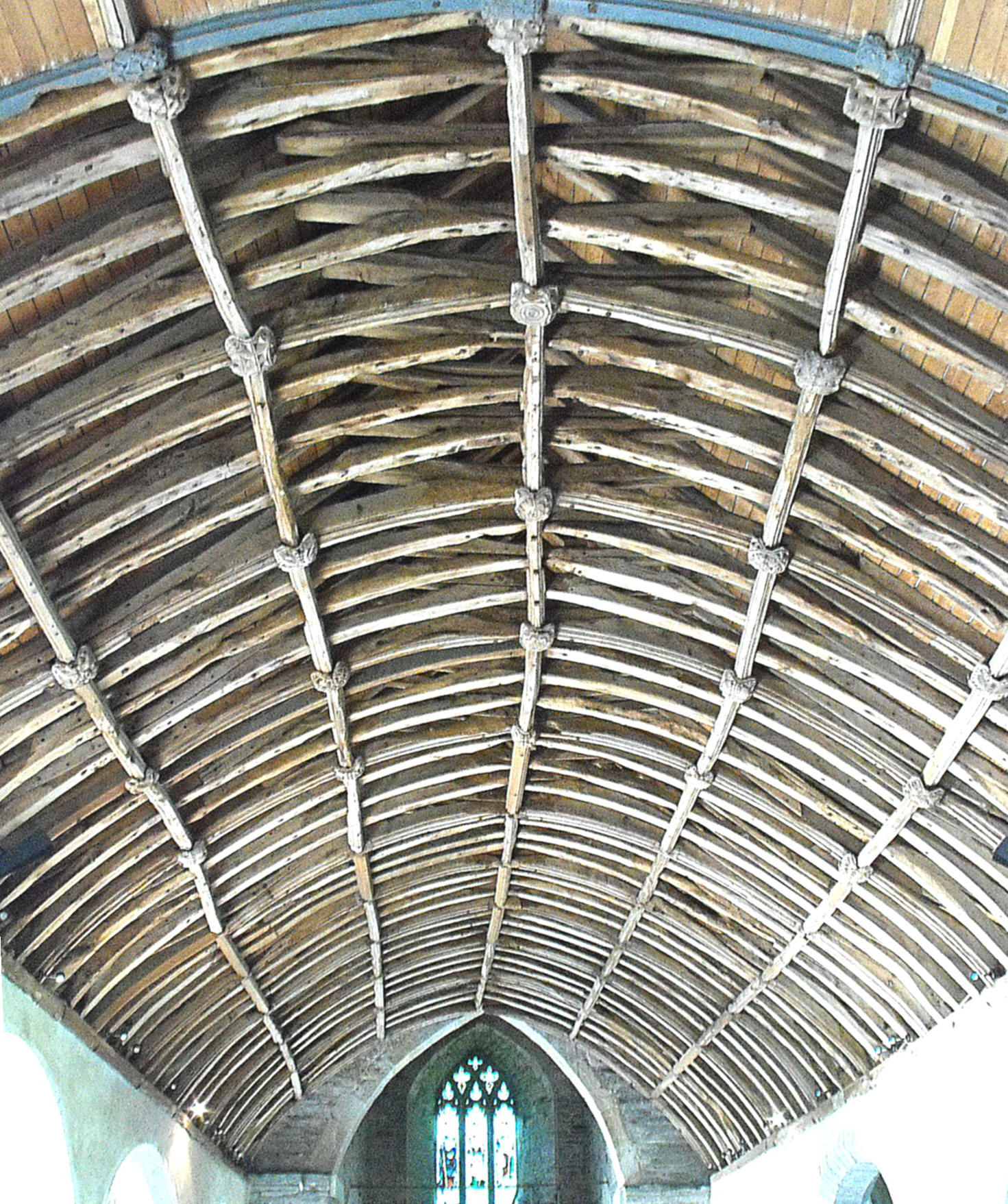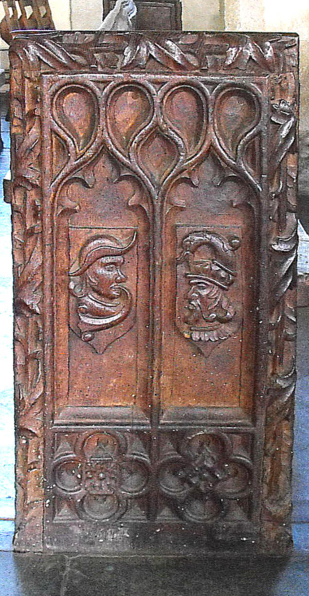 However, unquestionably more notable than these is the church woodwork, especially the excellent wagon roofs to the nave and aisles, with moulded ridge pieces and purlins at the one-third and two-third stages in the former (as shown in the photograph below) and at the halfway stage in the latter, and carved bosses where the purlins cross the principal ribs. The sixteenth century bench ends to the restored nave benches are also of interest for their elaborate, fine carvings, featuring figures, fish, birds and animals in blank cinquefoil-cusped ogee arches above Tudor roses in quatrefoils in squares. (See the two examples above.) Finally, the carved, painted seventeenth century panelling round the western end of the S. aisle (south and west walls), formed of arches holding shields, separated by Ionic pilasters, originally formed part of a family pew before being placed here in the restoration of the church, carried out by E.H. Sedding (a nephew of the better-known John Dando Sedding) in 1906. (See the notes in the church.)