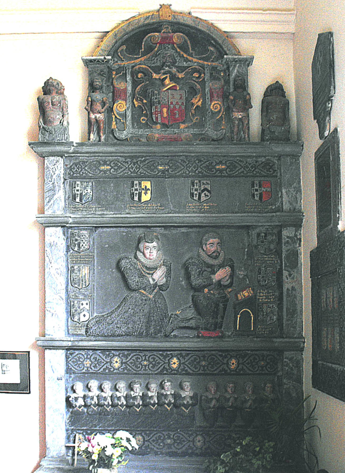 Next to it on the right, a bas-relief from a dismantled tomb-chest, portrays William Achym (d. 1589), who is shown 'in armour and puffed breeches, with his ruff, dagger and sword. The carving of the face is curious, and is said to show that Achyn died of a stroke' (Parish Church Pelynt, p. 4).