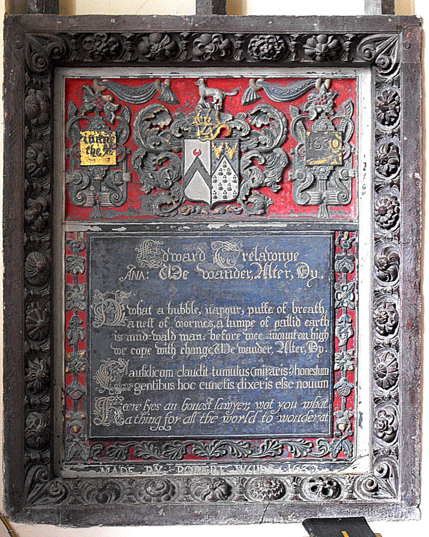 The church contains no old woodwork or other furnishings but there are several slate wall monuments of interest in the chancel and transept, of which the foremost, complete with tomb-chest below, is set against the sanctuary N. wall. (See the photograph below left.) This commemorates the lives of Francis Buller (d. 1615) and his wife, whose profiles, shown facing southeast, are portrayed in bas-relief, supported below by their four sons and eight daughters, all kneeling in supplication. There are also two monuments on the S. wall of the sanctuary, immediately opposite, of which one (shown below right) is a square panel dedicated to the memory of Edward Trelawnye (d. 1630). Signed by Robert Wills, it is accompanied by an inscription, part of which reads,