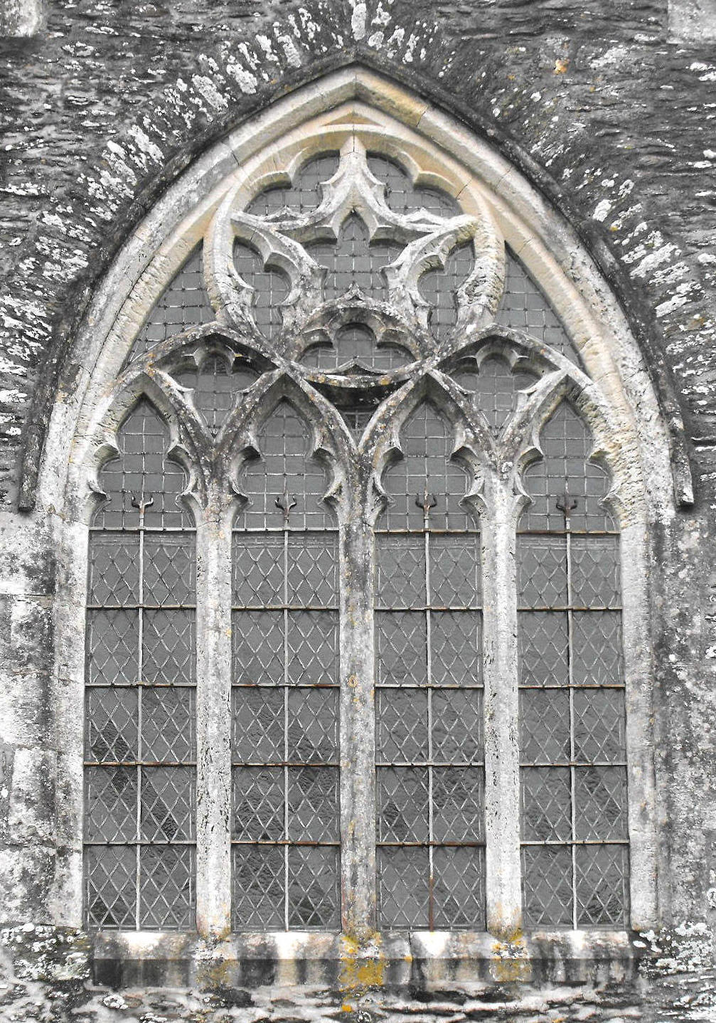 The nave and chancel are lit to the south by cinquefoil-cusped Y-traceried windows, although there is space for only three of these and a two-light Victorian window. The windowless S. porch is diagonally-buttressed and has a plain outer doorway, a restored wooden wagon roof, and an inner doorway bearing a sunk quadrant. The transept windows are interesting and different on each side, being three-light and reticulated to the west, four-light with equal lights subarcuated in pairs and a circle above containing a five-pointed star surrounded by 'bat-winged' trefoils to the south (see the photograph below left), and three-light with a lowered central light and a circle containing a small six-pointed star surrounded by deeper bat-winged trefoils to the east (as illustrated below right). The five-light E. window to the chancel has an elaborate form of cusped intersecting tracery, featuring subarcuated ogee lights with a pair of trefoils and a dagger above each, and secondary tracery within the first tier of reticulation units. The nave and chancel are built without structural division so only the internal lay-out of the furnishings and the raising of the chancel floor by one step, demarcate their positions. The chancel has a triple sedilia formed of two-centred equal arches and an ogee-pointed piscina, recessed in the S. wall. The S. transept arch carries two sunk quadrants, the inner springing from shafts with fillets and semi-octagonal capitals, while within the transept itself, a squint looks through the east wall into the chancel, and two tomb-chests beneath ribbed coving, with recumbent effigies on top - ascribed to Lady Emiline and Sir Edward Courtenay, d. 1371 and 1372 respectively (see the notes in the church) - take up the entire width of the S. wall. Perhaps these dates are significant, for while all the work described in this paragraph is ostensibly Decorated in style, some elements of its vocabulary (the use, for example, of sunk quadrant mouldings) suggest a rather later date than that usually implies. Indeed, perhaps this transept was built specifically to house these tombs?