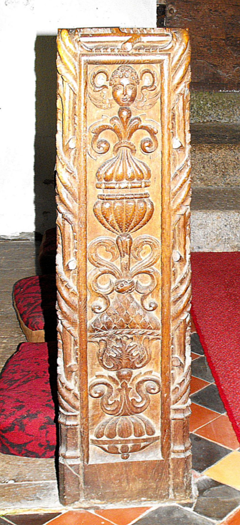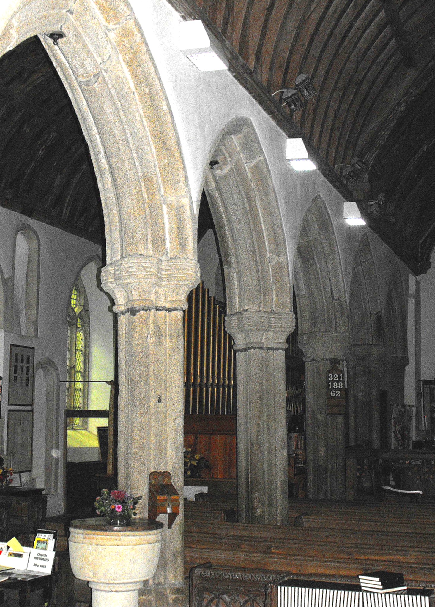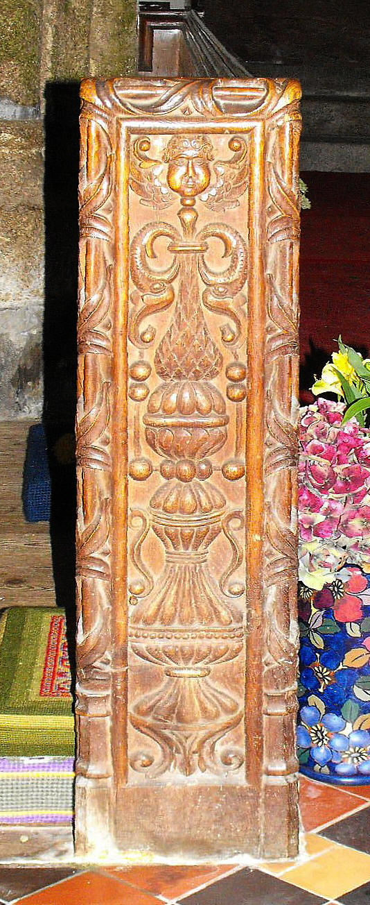 The N. aisle is a Perpendicular addition to the building, lit by three-light N. windows with typical alternate tracery, a four-light E. window with alternate tracery and intersecting subarcuations of the lights in pairs, and a window to the west which is an exact copy of the S. transept S. window (as may be seen in the photograph at the top of the page), suggesting it was once the N. transept N. window, which was subsequently re-set here. The six-bay aisle arcade (illustrated left, from the southwest) is composed of arches of two orders bearing convex mouldings, springing from compound piers formed of four major and four minor shafts, with capitals around the major shafts only. A rood stair in the N. wall of the aisle clearly once gave access to a loft, and immediately to the west, a tomb-chest that probably once stood in the N. transept, features the effigy of another knight, identified in the notes in the church as the brother of Lady Emiline. However, the best work to be seen in this aisle is the excellent wagon roof with carved wall plates, a moulded ridge piece, moulded purlins at the halfway stage, and carved bosses where these cross the principal ribs. Cornwall is a great county for roofs such as this and a set of particularly fine ones can be found, for example, at Lanteglos-by-Fowey. Other noteworthy features of the building include the sixteenth century(?) carved bench ends, mostly displaying traceried designs although a few include figures. (See the two examples, below left.) The font consists of a circular bowl supported on a circular stem and is probably late Norman.