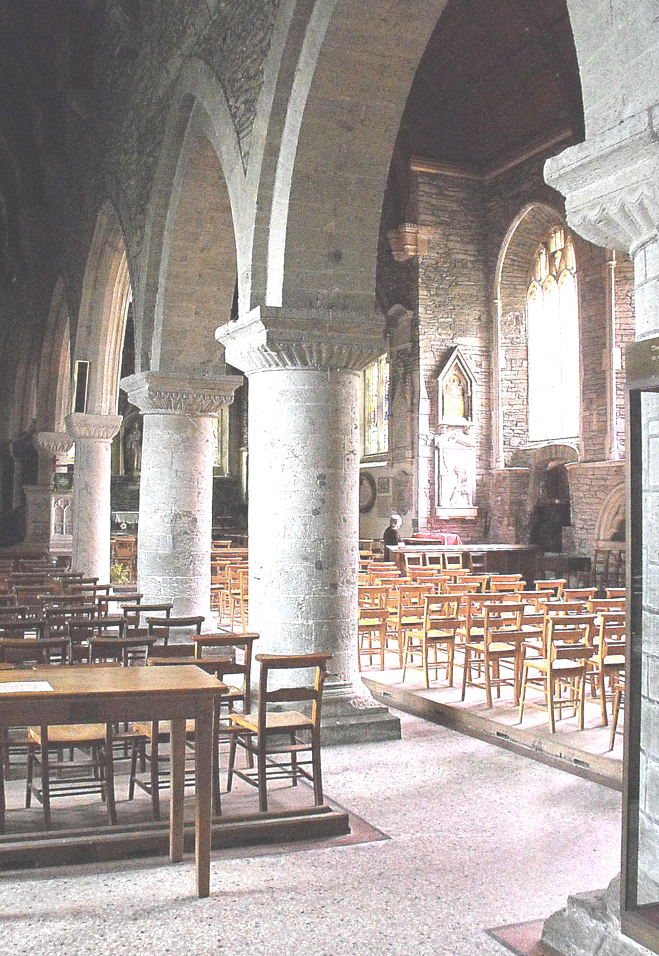 Transitional work in the nave comprises the two unequal western bays of the arcade (seen in the photograph, below left, viewed from the west end of the nave), formed of pointed arches of two plain orders, supported on very wide circular piers with square scalloped capitals and a matching W. respond. They are continued eastward by four similar but slenderer bays, built after the partial collapse of the original work in 1592 (St. Germans Church; a History and Guide, p. 16). Well before this however, perhaps around 1340, the widening of the two eastern bays of the aisle to form a chapel, required the construction of new windows, of which the westernmost S. window survives. Whatever windows were inserted further east were themselves replaced in Tudor times by the two uncusped, three-light windows present today, which are much less attractive but seen to better effect inside, for reasons that will appear below. The E. wall is pierced by a pair of three-light windows at the lower level, with central lights stepped down and wheels of tracery above, and a third three-light window above and between. The lower windows are separated by a niche, now housing a modern statue of Christ the Good Shepherd, and the S. wall shelters in a recess the remains of a large tomb-chest, which at some point in time has been badly vandalised.