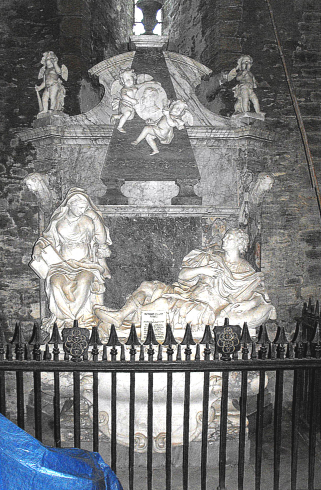 No less worthy of consideration is the principal monument in the church, notwithstanding the dark and dingy position it now occupies beneath the northwest tower. Described by Pevsner as 'the most ambitious monument in Cornwall', this is the work of Michael Rysbrack (1694 - 1770), the greatest statuary working in England in the early eighteenth century, albeit that it is, admittedly, one of the artist's earliest signed works and looks, perhaps, somewhat disjointed, with its constituent elements rather too far apart. Commemorating Edward Eliot (d. 1722), it is particularly interesting, however, for the striking contrast it provides to Rysbrack's monument to John Knight (d. 1733), at Gosfield in Essex, who had married Eliot's wife's sister (née Cragg), for whereas there, the seated figures of the deceased and the donor occupy positions of near equality, here, Eliot is shown reclining on his left elbow while a seated female to his right (who may or may not have been intended to be his wife) looks down solicitously, while above, putti bear his medallion portrait up to heaven in accordance with a well-worn, suitably elevated theme for 'polite' monuments in the days of the Whig supremacy. The Latin inscription translates as 'This is a monument to their undying love, the weeping, yearning and longing of spirit; a wife, alas, once very happy, places this until his and her ashes may be put together', and Matthew Craske records that Eliot's widow's 'reaction to bereavement was intense. While Edward Eliot's brother... inherited, she retired.. [and u]nder the influence of [Alexander] Pope she embraced Catholicism and followed the continental pattern of a life of prayerful meditation until her death (The Silent Rhetoric of the Body, New Haven & London, Yale University Press, 2007, pp. 279-280). Compare that with the behaviour of her sister at Gosfield indeed!