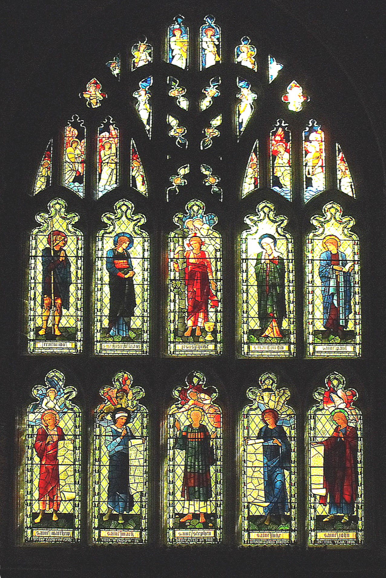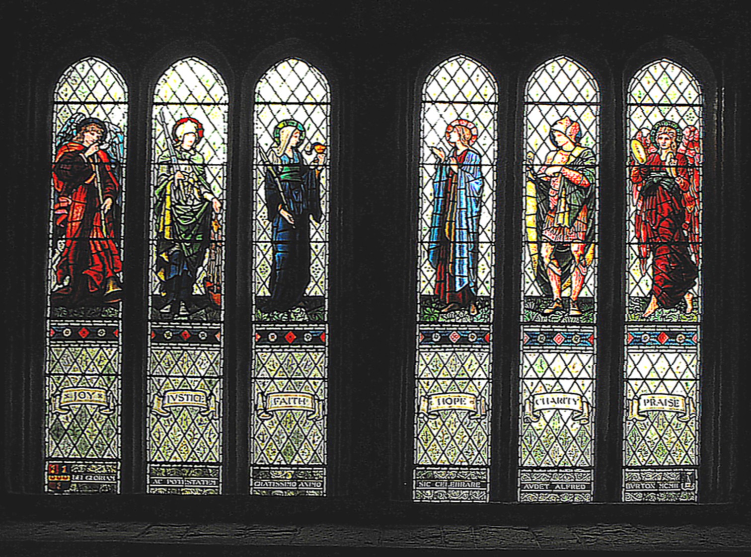 Perhaps unsurprisingly after all these changes of plan, carpentry in the building is largely lacking in interest, but the church contains some important stained glass and monuments that demand attention. The most important glass is to be found in the chancel E. window (seen above right) and in the two square-headed S. windows in the chapel (illustrated below), which was designed by Sir Edward Burne-Jones (1833-98) and executed by William Morris & Co. It features the four Evangelists and St. Stephen in the E. window lower tier, Christ flanked by SS. Mary and Mary Magdalene in the E. window upper tier, and the allegorical figures of Joy, Justice, Faith, Hope, Charity and Praise in the chapel S. windows, and 'brings home most forcibly the value of William Morris's reform. Here are clear outlines, pleasing patterns, and simple colours in sufficiently large expanses to be taken in individually. No overcrowding, no competing with the art of painting, and yet a sentiment that is wholly of the C19' (Pevsner).