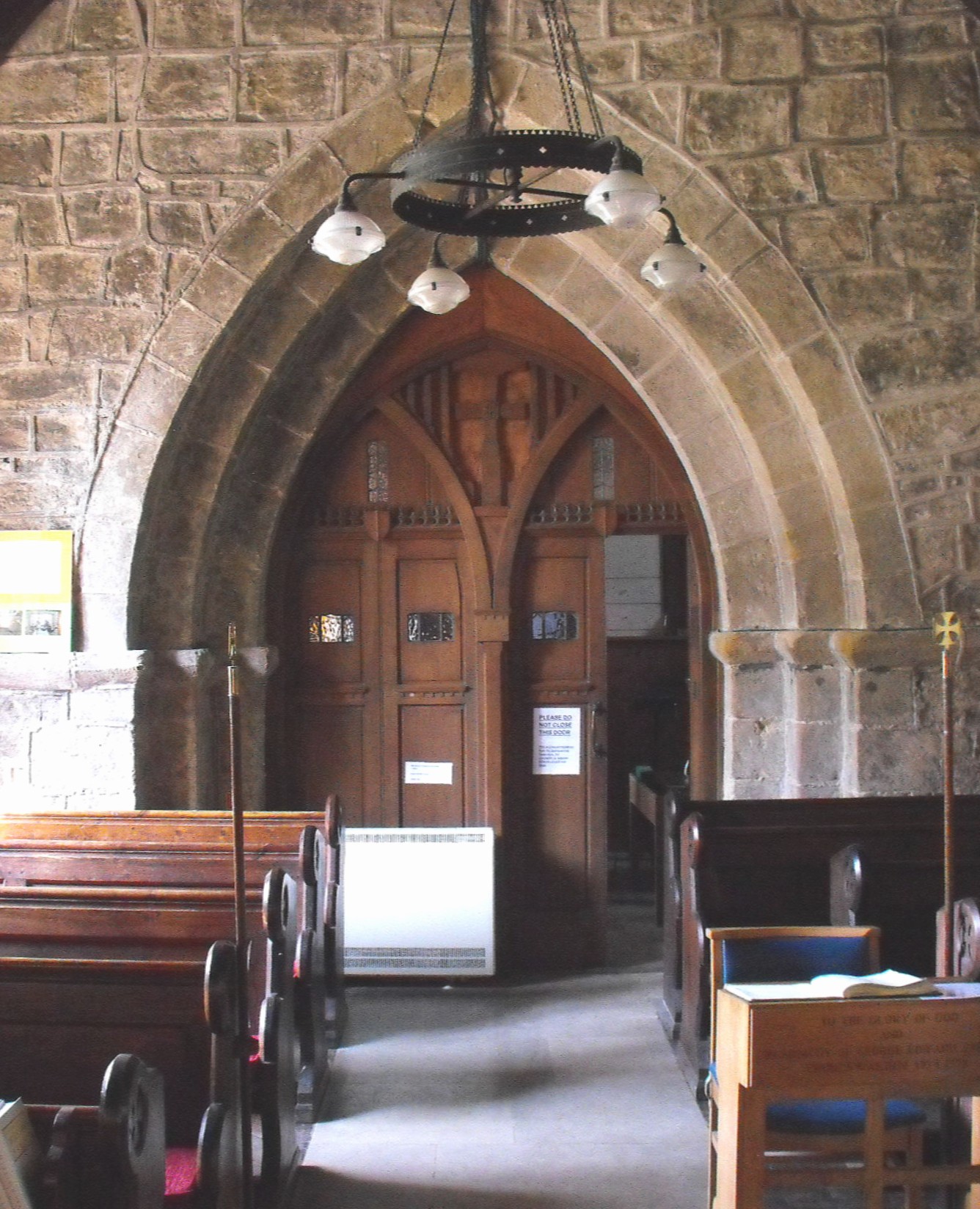 Save only for the squat but very broad W. tower, this church was almost entirely rebuilt in the late nineteenth century, but the one feature that was allowed to remain was certainly a significant one – the twelfth (or, perhaps, late eleventh) century S. doorway inside the porch, with chevron round the arch, a sparse adaptation of beakhead decorating the single order of shafts, and a carved tympanum (illustrated below) displaying one of those extraordinarily incompetently arranged scenes of which only the Normans were capable. Portrayed in shallow relief, the subject is probably intended to represent the Agnus Dei (Nikolaus Pevsner & Elizabeth Williamson, The Buildings of England: Derbyshire, New Haven & London, Yale University Press, 2002, p. 245), but the figure is exceptionally naïve, and the animals that float around it, are equally badly drawn and appear to include a cow and a pig to the left, and a horse and a couple of birds to the left (but the writer of the notes in the church thought he saw a wild boar, fox, wolf and lamb). Presumably, such crude iconography appeared satisfactory to the artist and many of his fellow villagers. The wooden door beneath is probably contemporary, formed of four vertical boards outside and nine horizontal boards within.