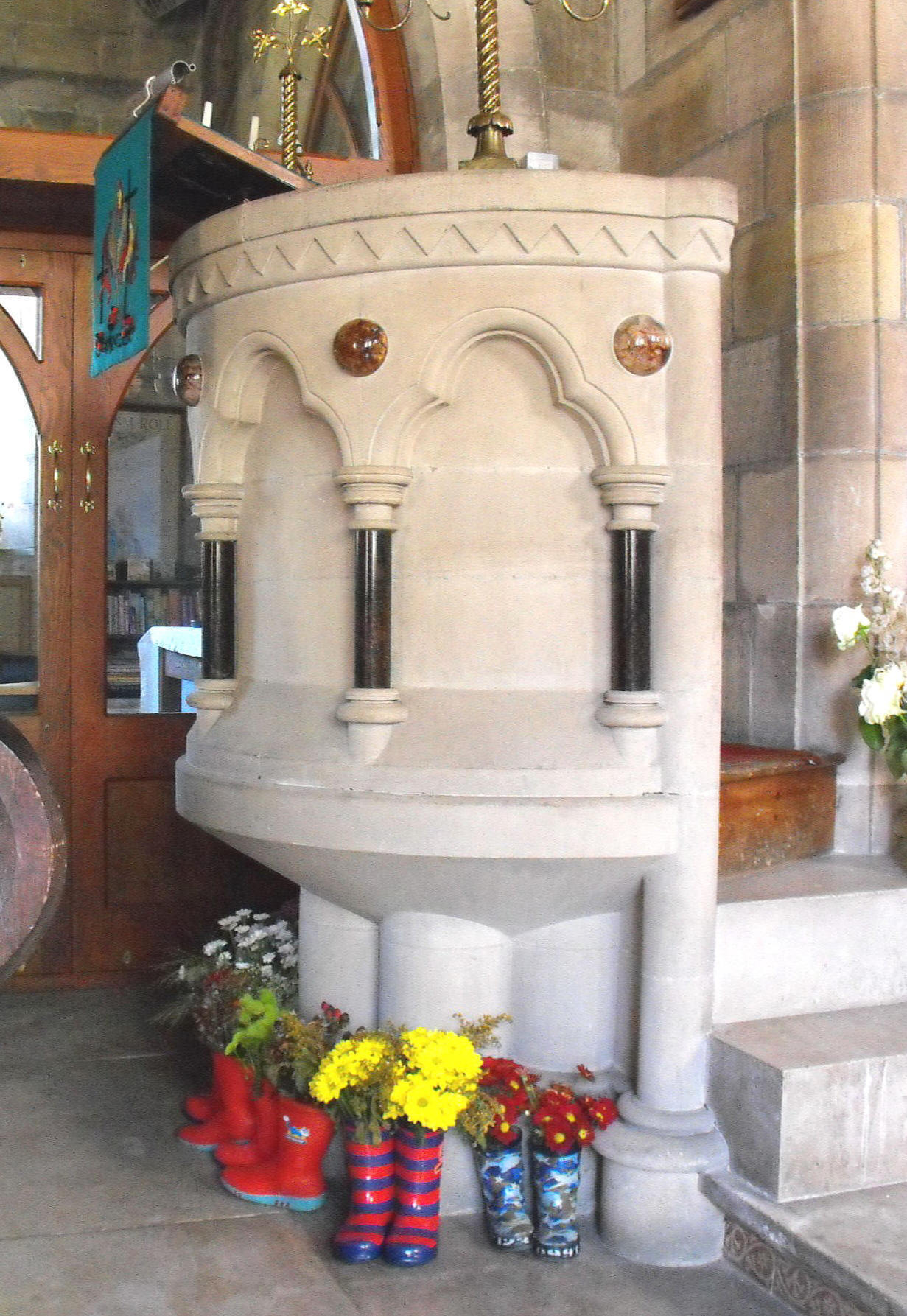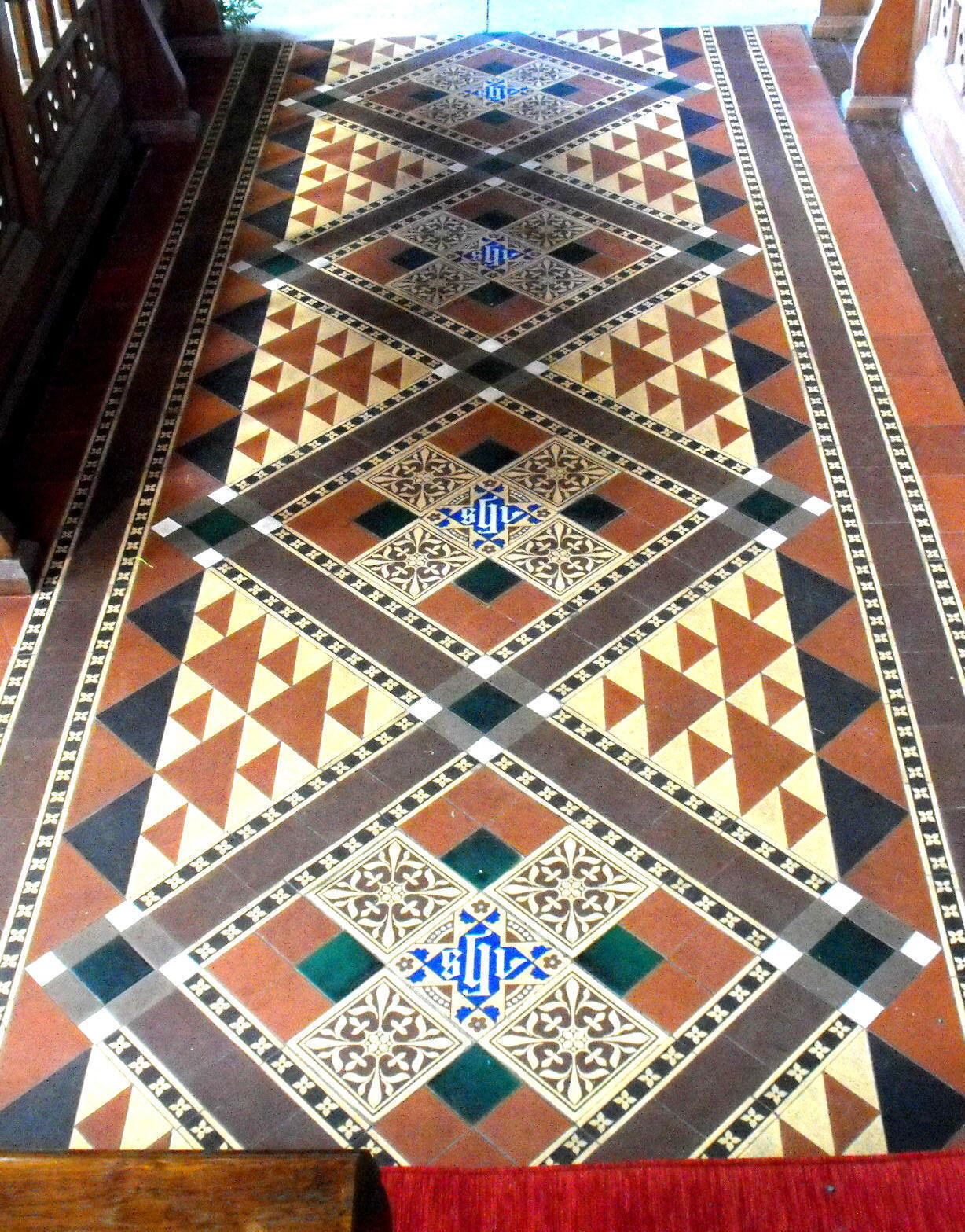 The rest of the building is attributed to F.J. Robinson of Derby (1833-92), who was also responsible for the N. aisle at Brassington, about three miles to the north. He fulfilled his contract with tolerable success there, notwithstanding the gross mistreatment the church had received (or would later receive) from other, less competent hands. Here, however, the work is consistently inventive and well designed, but is it actually Robinson’s work, for Pevsner recorded that before Robinson undertook the job in 1879-81, George Edmund Street had provided a design that was subsequently rejected and Robinson’s pulpit (above right) and reredos, in particular, decorated with protruding hemispheres of polished marble, are astonishingly reminiscent of Street’s designs at Denstone, Staffordshire, ten miles to the southwest. Whether an element of plagiarism has crept in, therefore, must be an open question, but there are certainly some interesting touches. The N. aisle (there is no S. aisle) is independently-gabled and continues alongside the chancel as a chapel, and the eastern section of that chapel, which serves its sanctuary, is divided from the rest by a little two-bay, transverse arcade (seen below left, looking north-northeast from the chancel) – a rare conceit in a building of this size. The pier at the S. end actually forms part of a double pier as it is 'fused' to the easternmost pier of the west/east arcade Finally, Robinson’s treatment of the rere-arches to the windows is also nicely varied, and his tiling patterns on the chancel floor are excellent. (See the photograph below right, showing the central aisle through the chancel, looking west.)