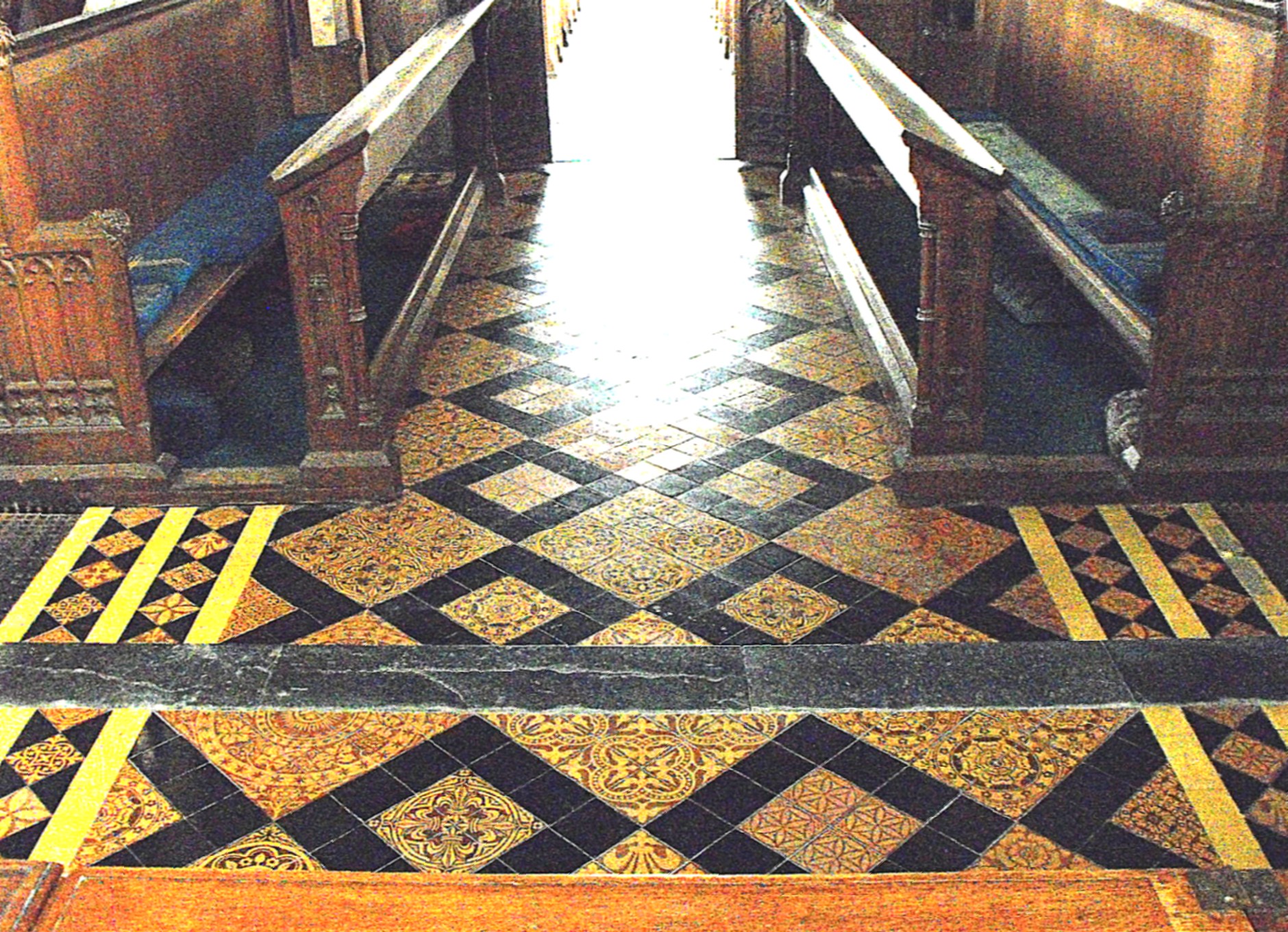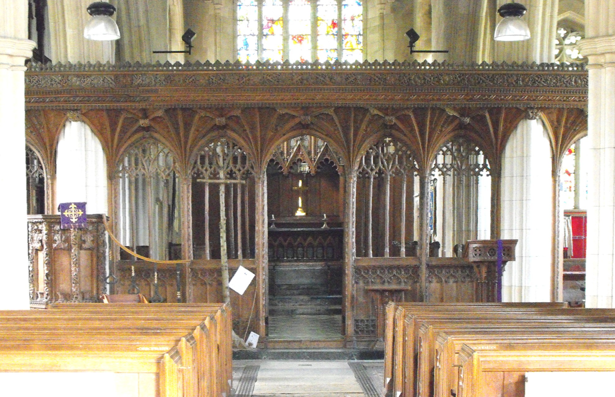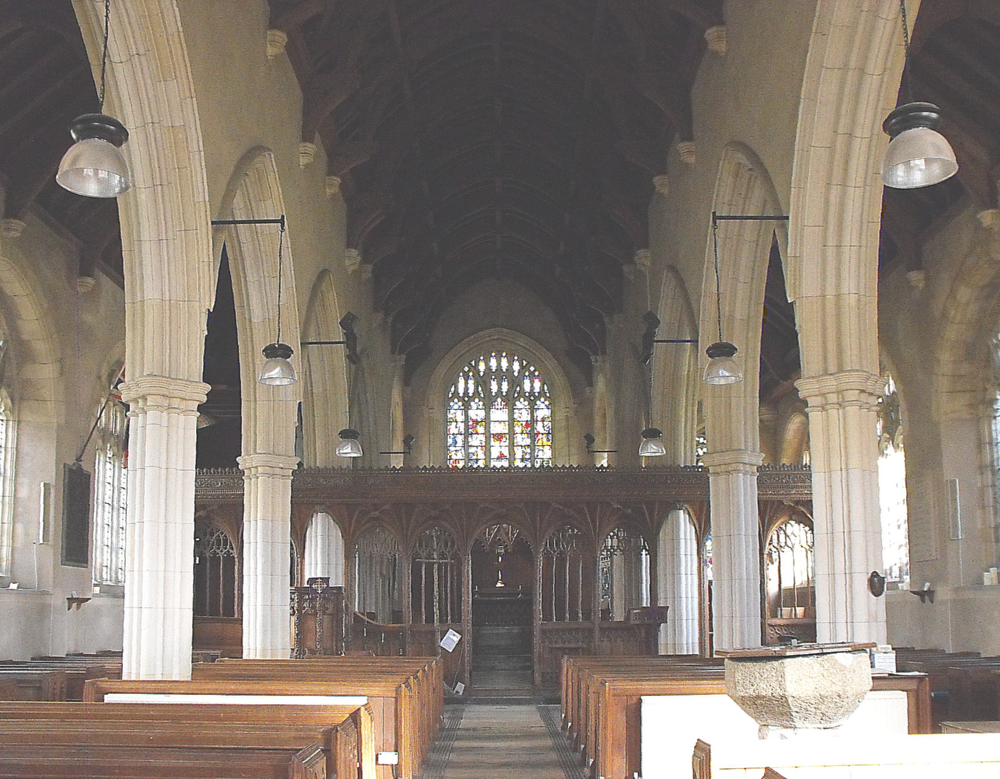 Inside the church, one should notice how the tall piers to the arcades are constructed of two materials - Beer Stone for the main shafts and Portland Stone for the bases – corresponding with Pearson’s re-use of the piers from the mediaeval church on the one hand and the additional lift he chose to give them to fit the dimensions of his new building on the other. The arcades comprise four bays alongside the nave, together with a fifth beside the chancel, forming chapels. There is no chancel arch and there are no transverse arches between the nave aisles and chapels, which are demarcated only in being slightly wider and by the intervening rood screen that runs across the full width of the church. The arches themselves are formed of three orders bearing a combination of sunk mouldings and rolls, while the piers are composed of four major and four minor semicircular shafts separated by hollows. There is no clerestory. The tower arch carries a series of hollows and wave mouldings on its two outer orders, which run down the jambs without intervening capitals, and there is a further hollow and wave moulding on the innermost order, supported on semicircular responds with capitals and fillets. The nave and chancel roof runs the full length of the church without structural division.