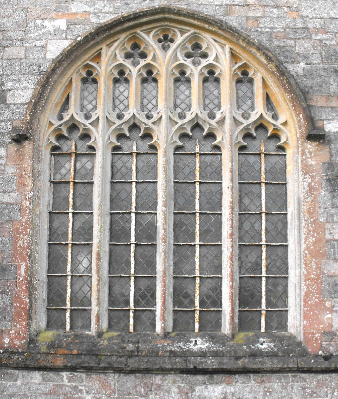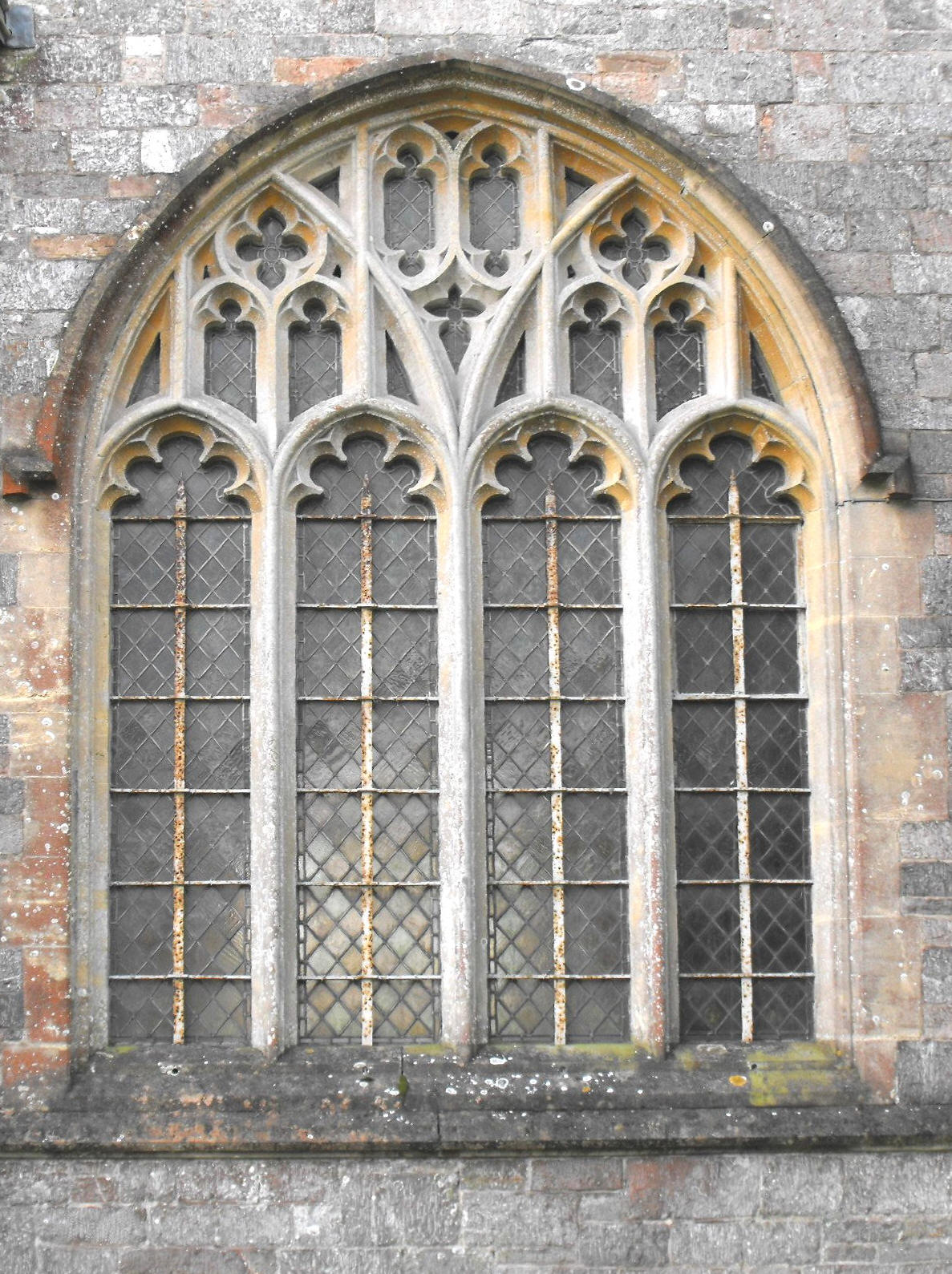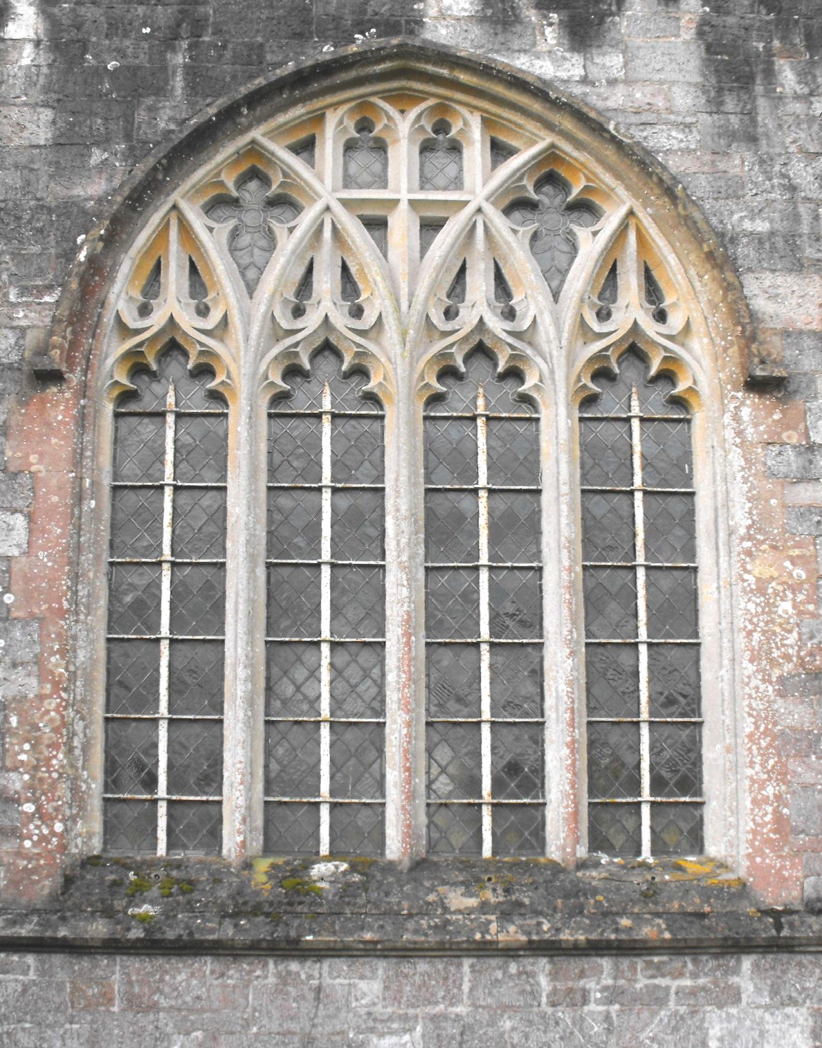 On first appearance, this church, raised on a new site by Pearson in 1878-80, scarcely looks Victorian at all, for it is built in the Gothic Revivalists’ despised Perpendicular style and parts of the stonework are quite ecidently old. The explanation however is that Pearson brought some of the masonry from the mediaeval building that now comprises a tower only and stands a mile to the east in the middle of Dartington Estate. Pearson’s new church, which adopts the 'exact same ground plan' (leaflet in the church) was erected nearer to the main centre of population in the parish although, viewed from outside, it is a somewhat uninviting structure - its character determined by the dark grey Devonian limestone from nearby Shinner’s Bridge from which the main walling is constructed and which the dressings and window traceries in Box Ground stone from the Middle Jurassic Series in Wiltshire do little to alleviate. In fact, Pearson re-used the window traceries from the old church for the chapels and sanctuary wherever he could and designed windows to match in the nave aisles and lower stage of the tower, and it is unfortunate he did not do so in the bell-stage also for the three-light bell-openings with Decorated reticulated tracery are distinctly incongruous. The nave aisle windows and tower W. window, in contrast, present an inventive set of variations on supermullioned tracery. (See the photographs and explanation below.) The three-light mediaeval E. window to the S. chapel, with curvilinear tracery, is the earliest surviving feature from the original church, while the re-set, five-light Perpendicular E. window to the chancel, raised very high in its new position, has more fine tracery and a statuette of a Madonna and Child in a niche over the apex.